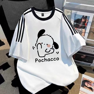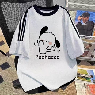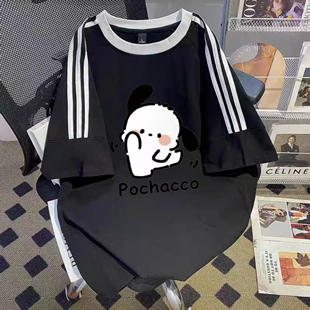 撞色上衣 t恤中大童夏季 2026新款 奶杏色女童帕恰狗三条杠纯棉短袖