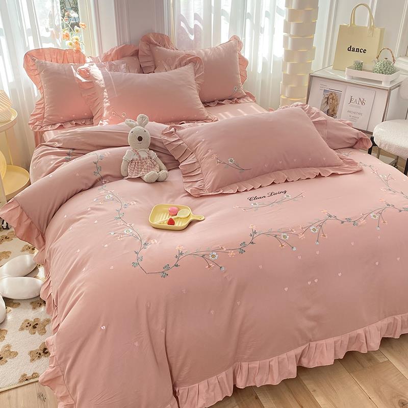 高档ins红夏季 纯棉全荷棉公主上风叶边被套小清新床裙1.8米床四件