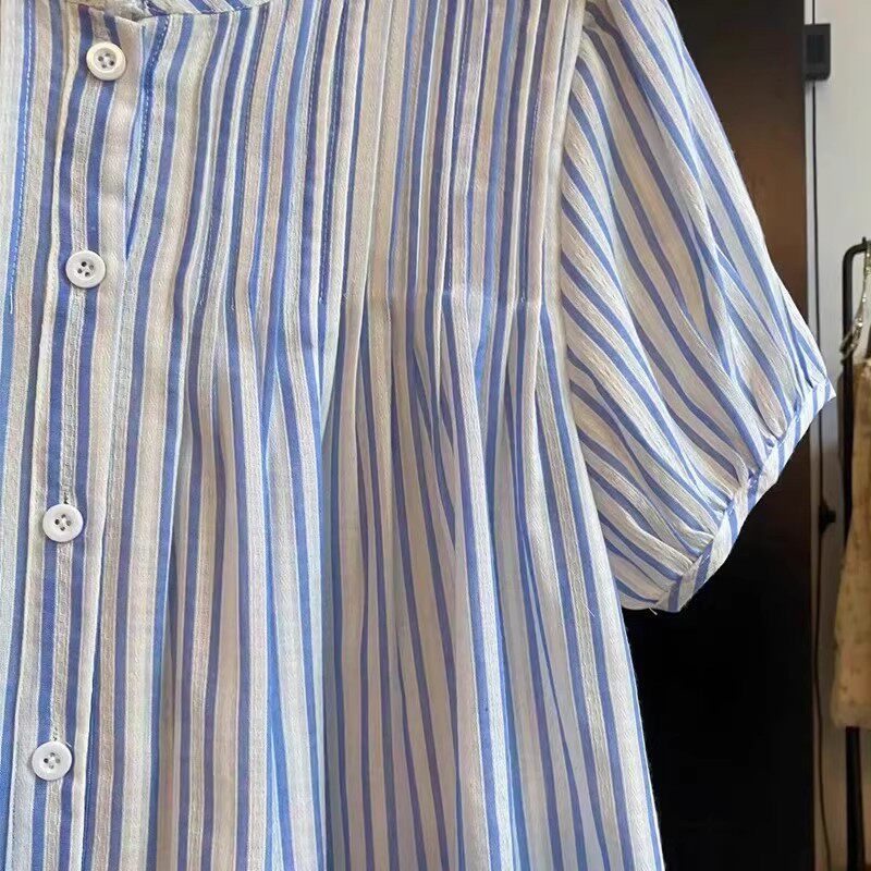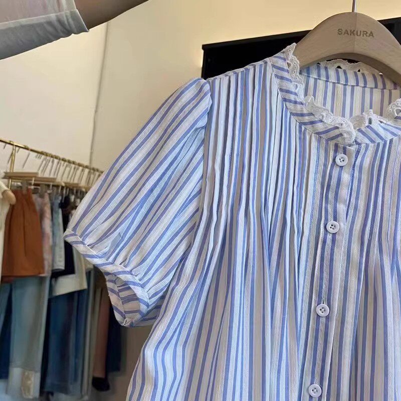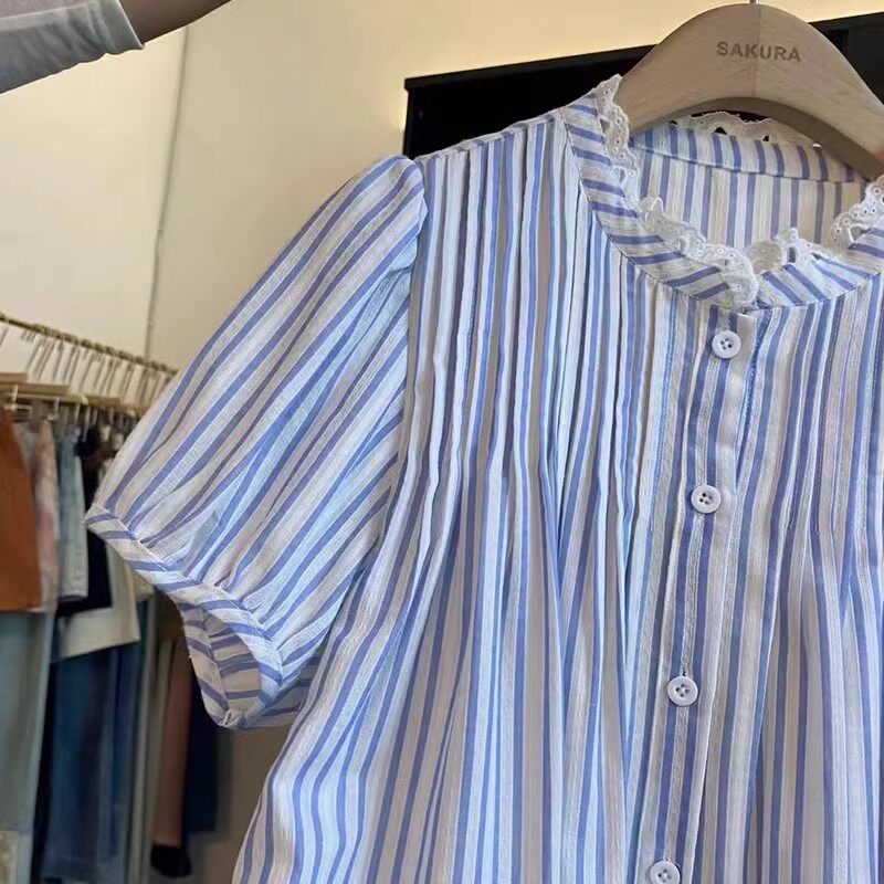 衬衫 300斤欧货重工蕾丝拼接短袖 女设计感蓝色条纹上衣 胖mm2 大码