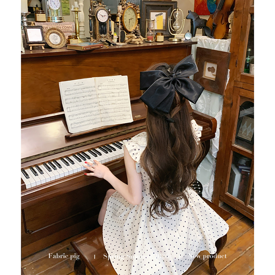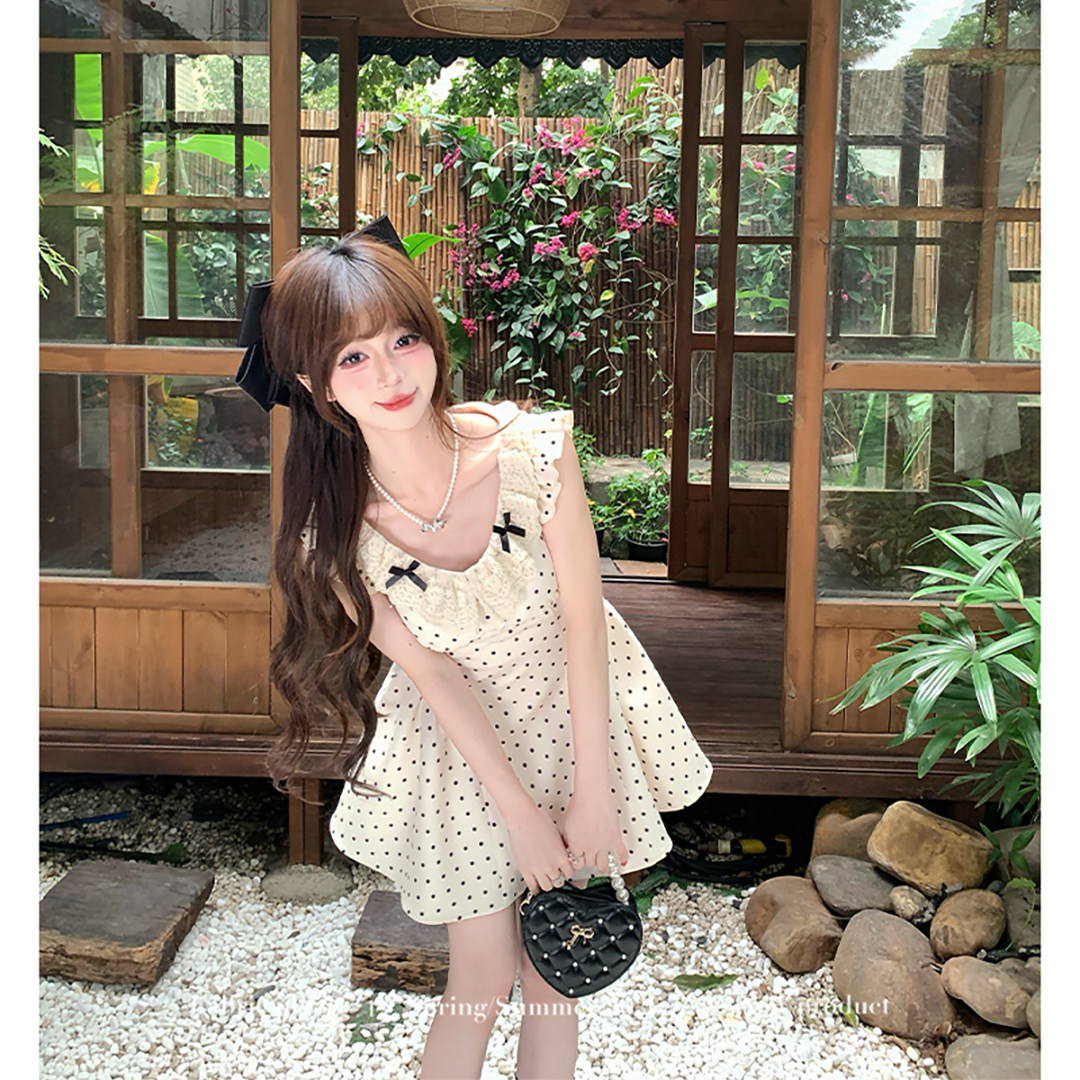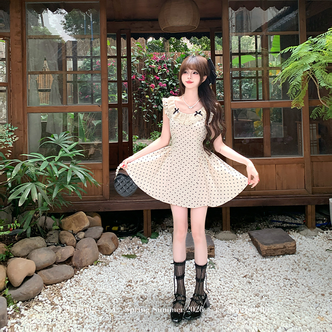 千金风miu系波点连衣裙女夏飞飞袖 法式 生日短裙 白栀奶昔 织物猪