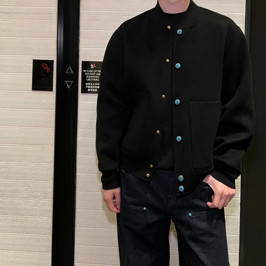 三福2025冬季 英文刺绣麂皮夹克撞色棒球领加绒宽松外套男510174