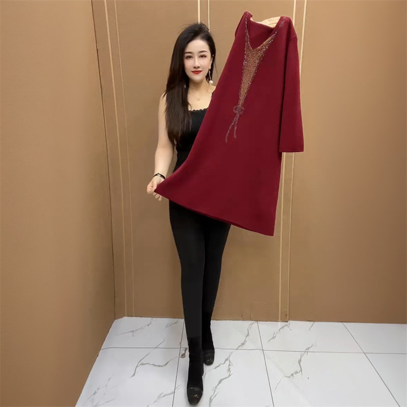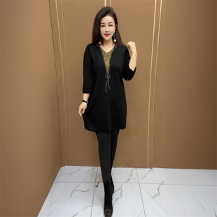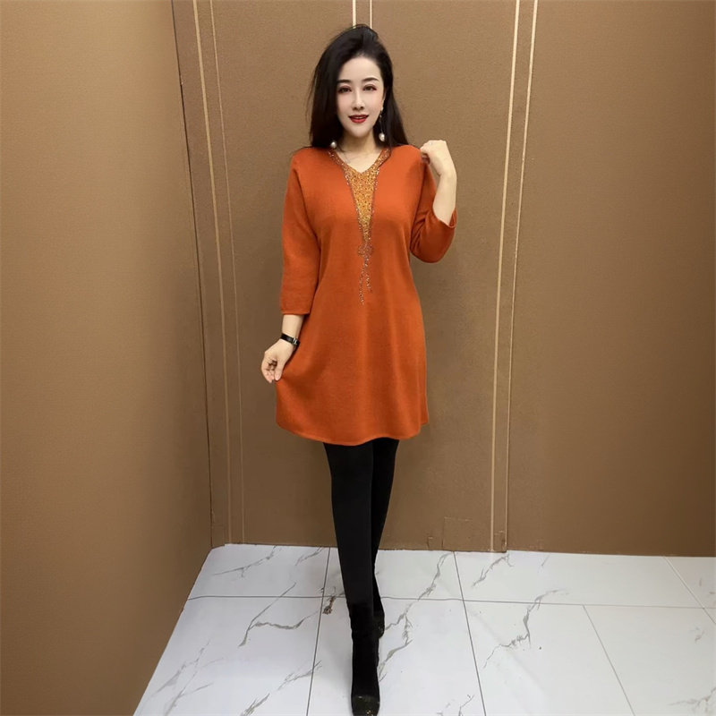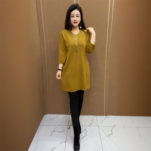 中长款 秋冬新款 减龄宽松妈妈装 衫 打底毛衣裙 高端洋气针织V领大版