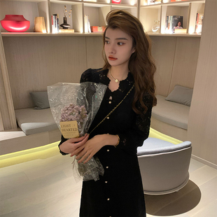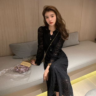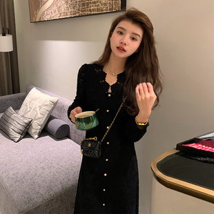 连衣裙女显瘦气质裙V领修身 蕾丝黑色长袖 减龄长裙子 NANA法式