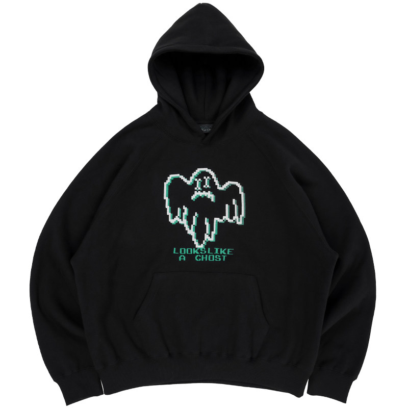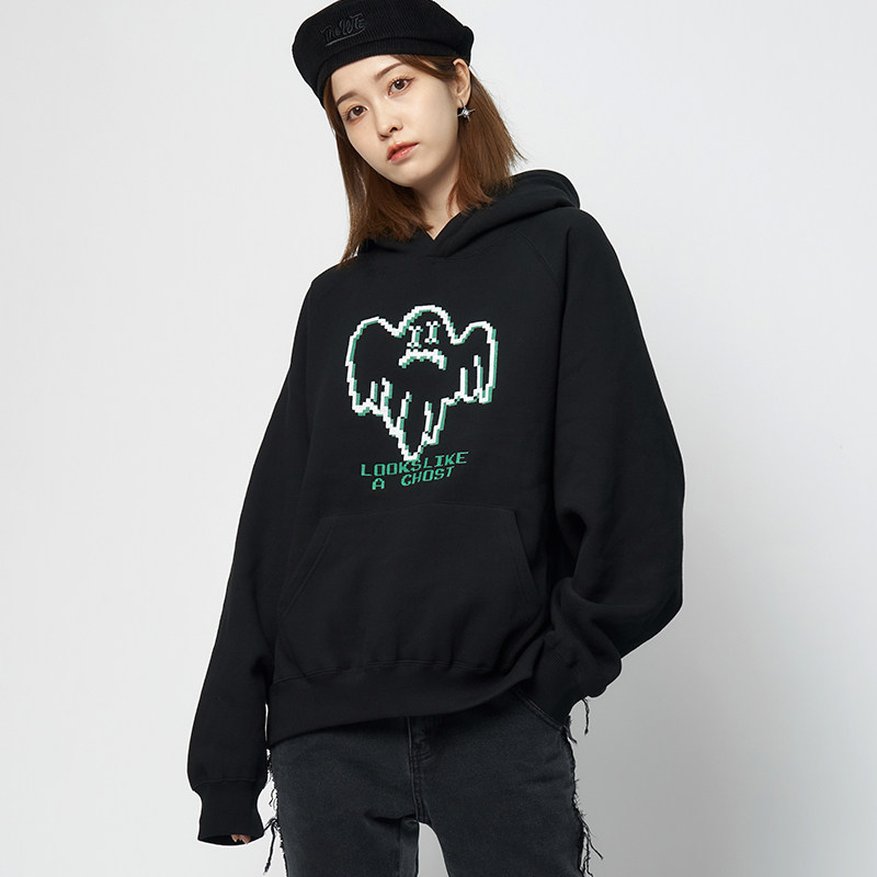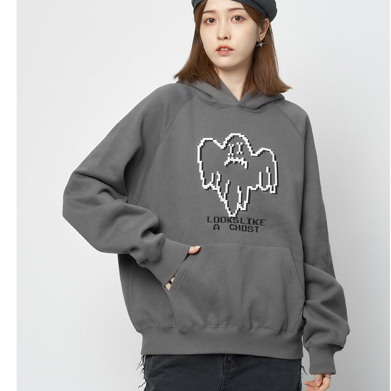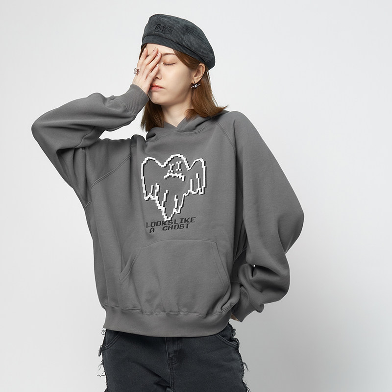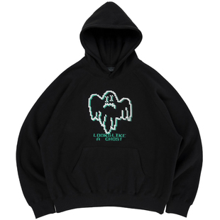 男女款 THEWIZBRAND 潮流原创黑灰色十字绣小幽灵刺绣连帽卫衣帽衫