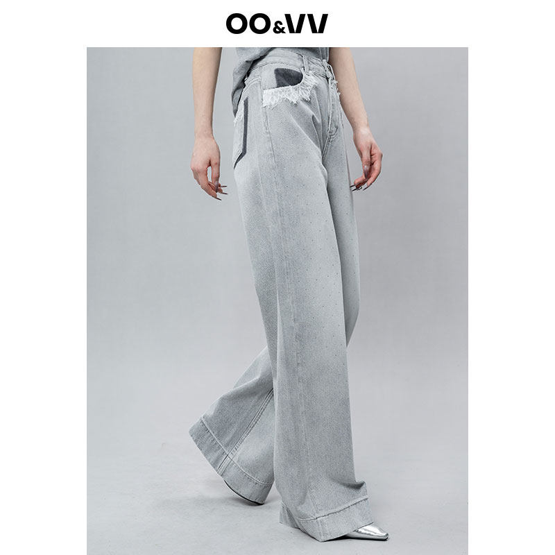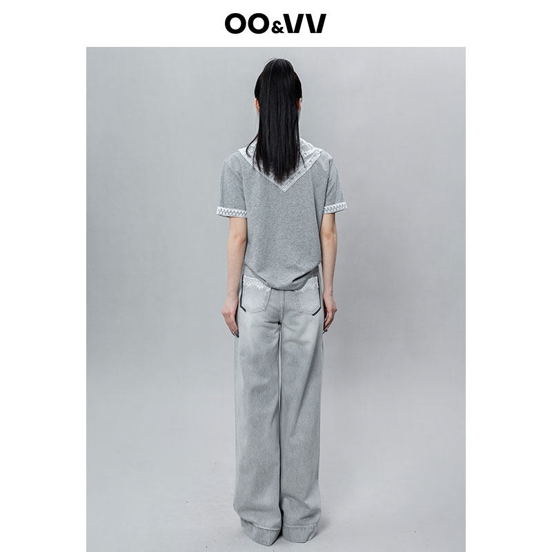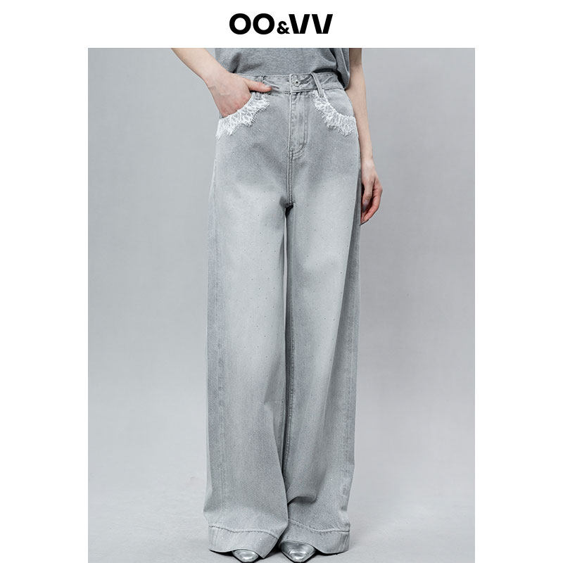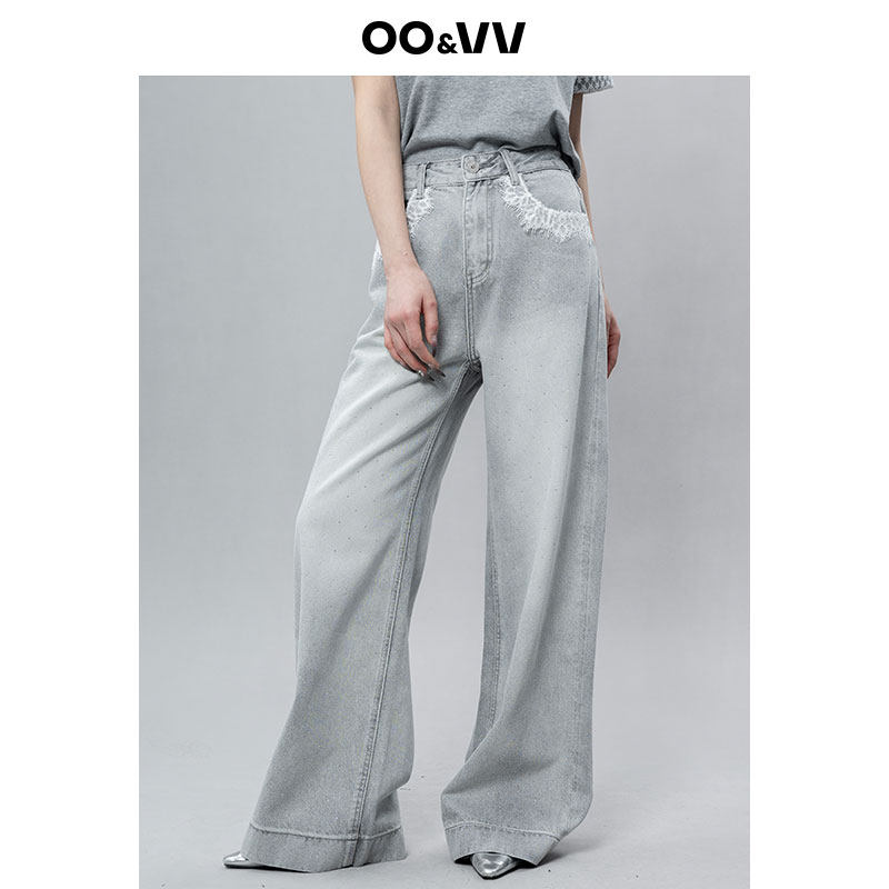 宽松休闲百搭直筒阔腿裤 oo&vv渐变色蕾丝拼接牛仔裤 女2025夏新款