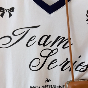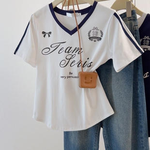 复古V领短袖 T恤夏季 新款 大码 显瘦百搭打底衫 胖mm美式 修身 上衣 女装