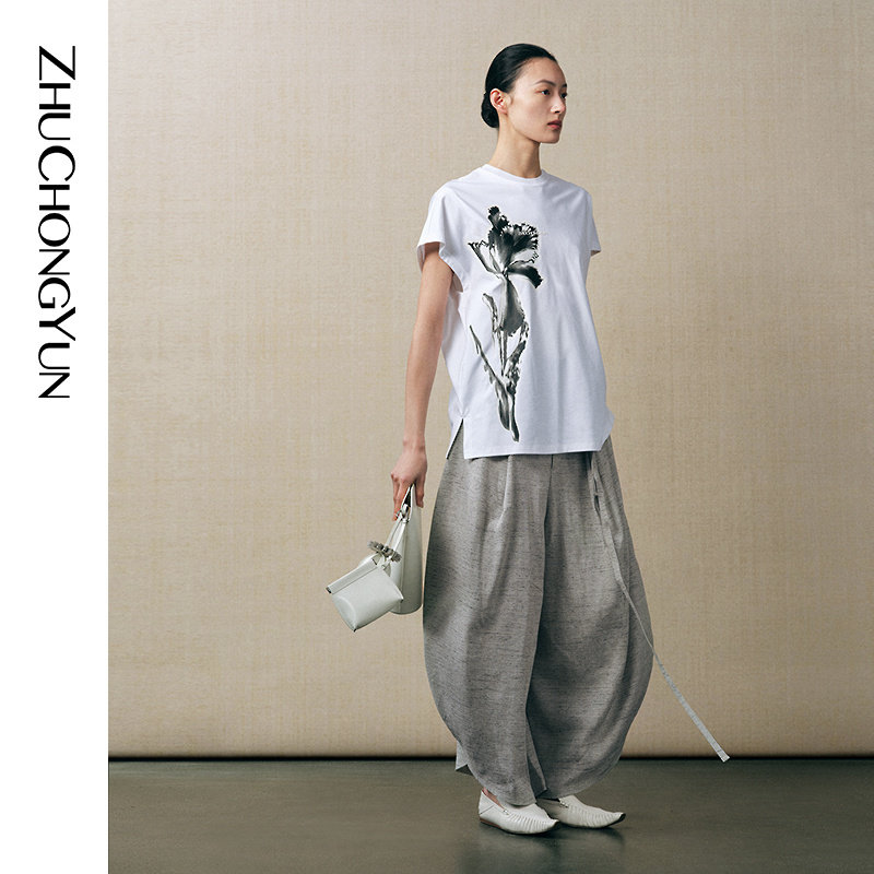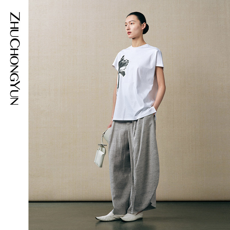 ZHUCHONGYUN春新款 弧型剪裁收脚抽绳长裤