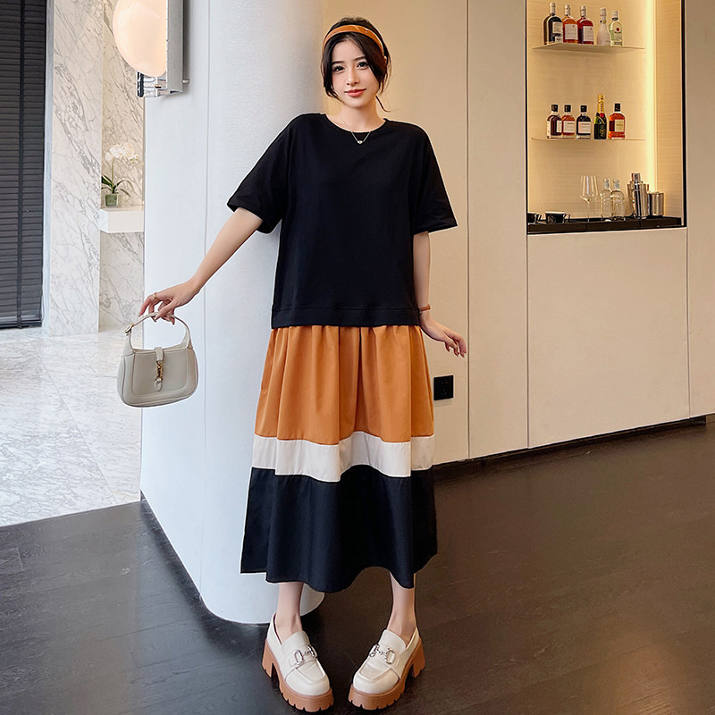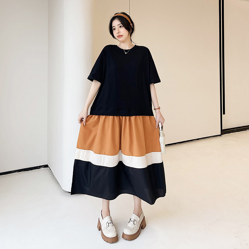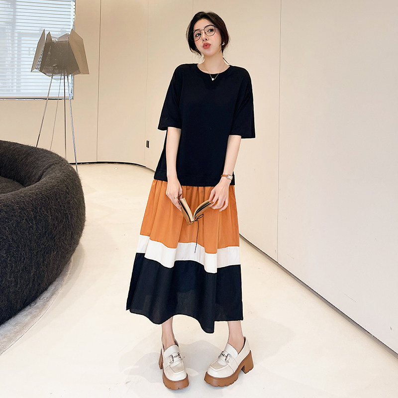 新款 大码 T恤长裙2026夏季 短袖 胖mm拼接撞色假两件休闲连衣裙 女装