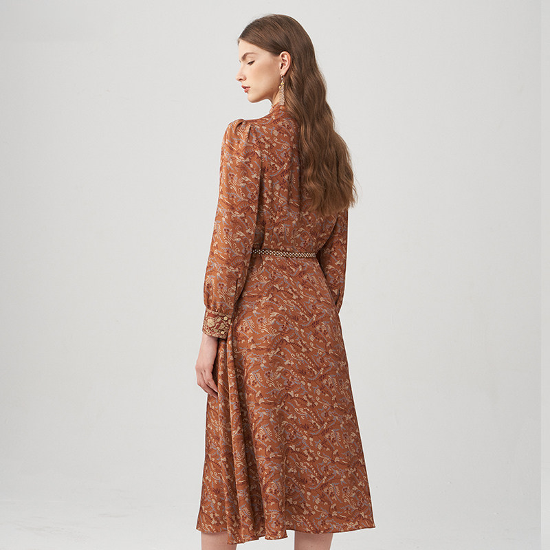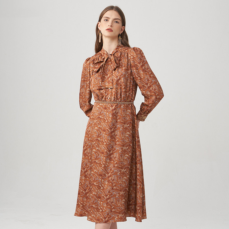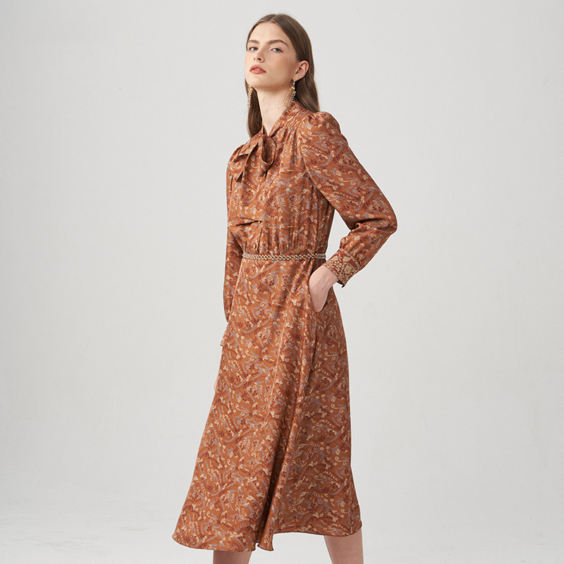 HUI卉绸缎桑蚕丝真丝中华缠枝海棠纹印花原创重工压褶连衣裙碎花