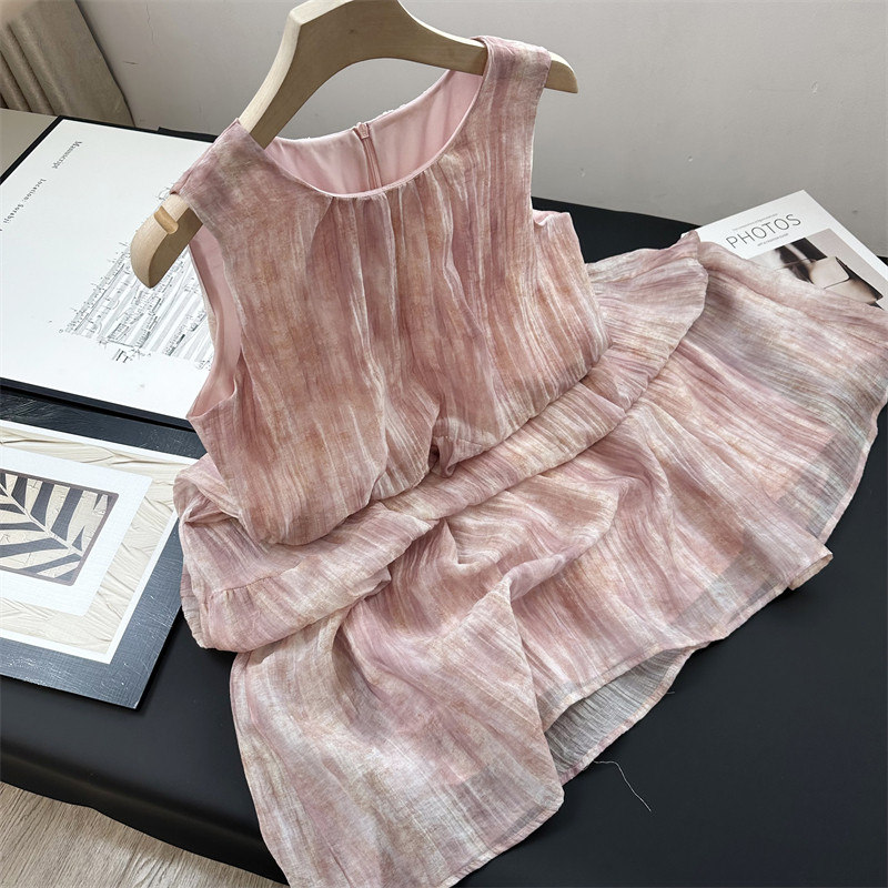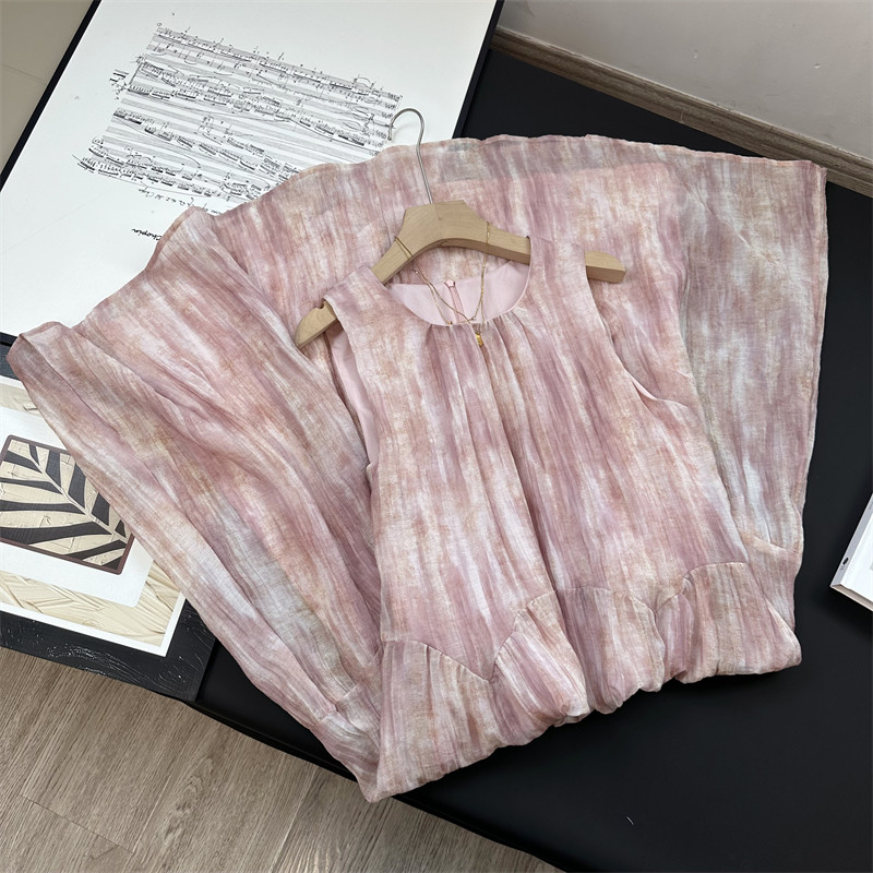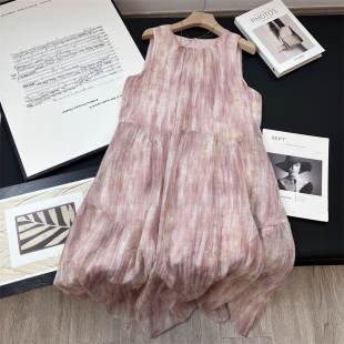 粉色扎染 背心长裙连衣裙女夏 天丝透气薄纱圆领度假气质宽松无袖