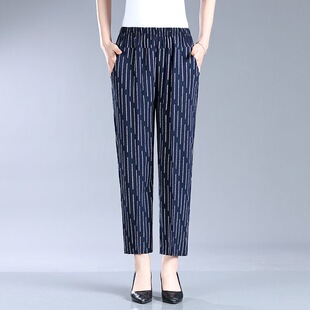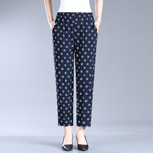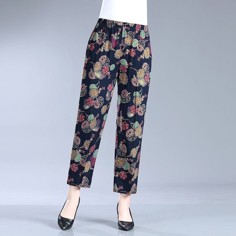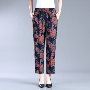 夏季 子奶奶妈妈棉绸裤 女裤 花裤 子 纯棉大码 中老年人造棉休闲九分裤