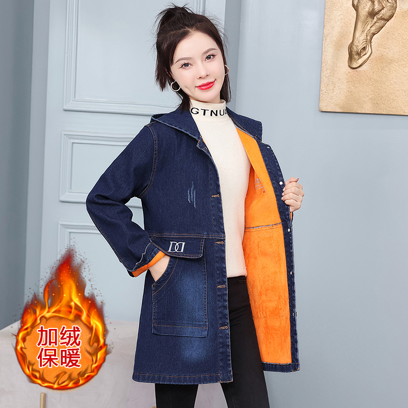 加绒加厚中长款 宽松显瘦百搭连帽风衣 牛仔外套女派克服2024秋冬季