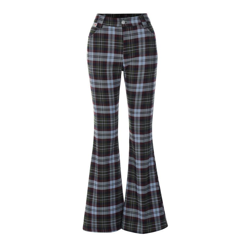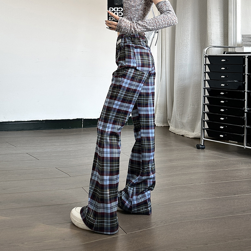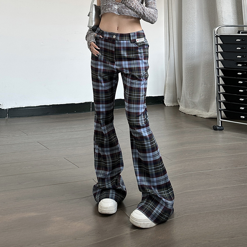 百搭显腿长裤 美式 辣妹时尚 2024春夏新款 子 复古格纹印花微喇休闲裤