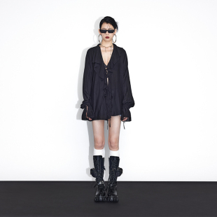 女春设计感衬衫 ourhour 黑色宽松轻薄衬衫 口系带 大荷叶边V领袖