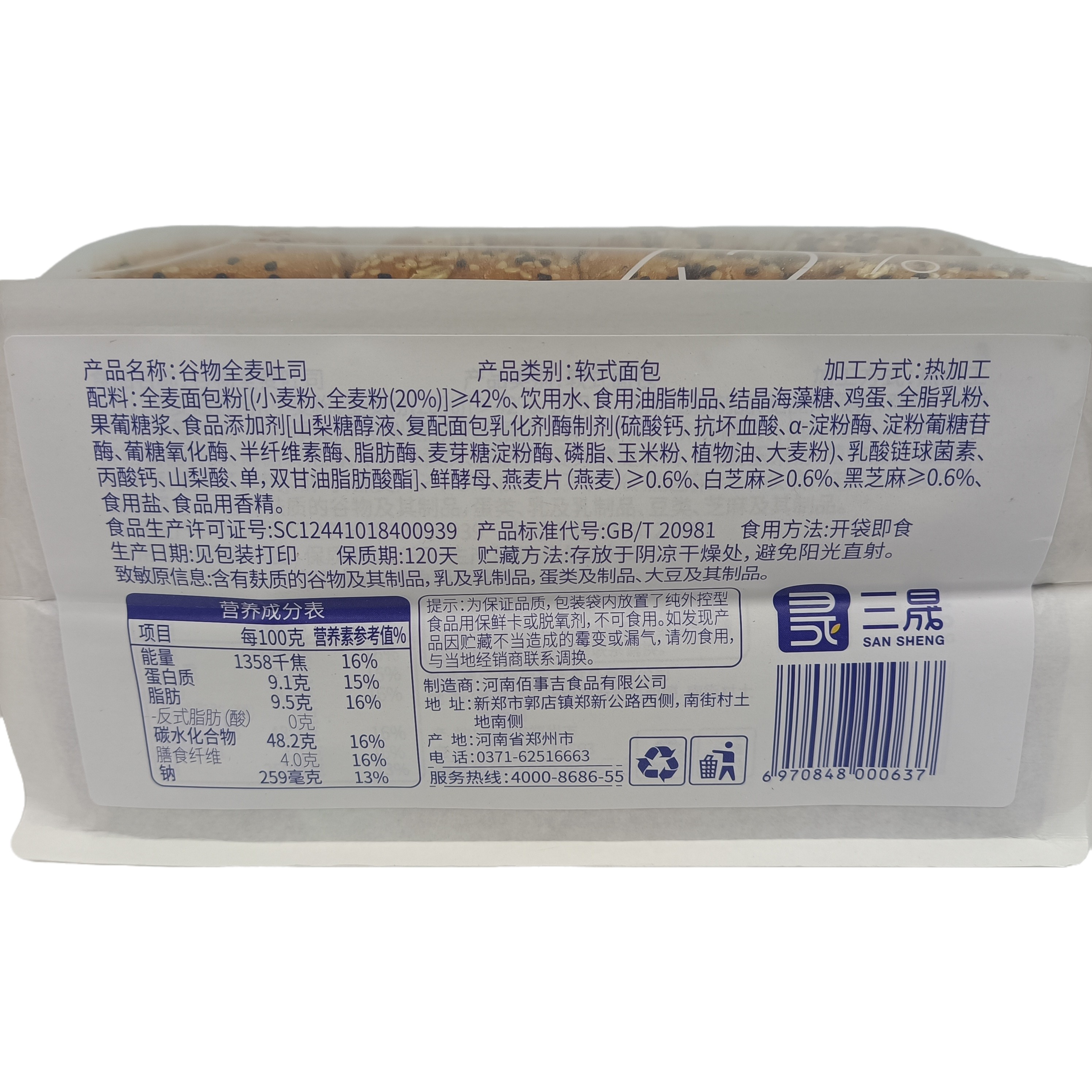 正品 袋早餐代餐饱腹轻食切片糕点 热销三晟谷物全麦吐司面包308g