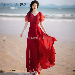 新款 法式 夏季 到脚踝大摆裙雪纺短袖 海边拍照度假裙 浪漫红裙子长款
