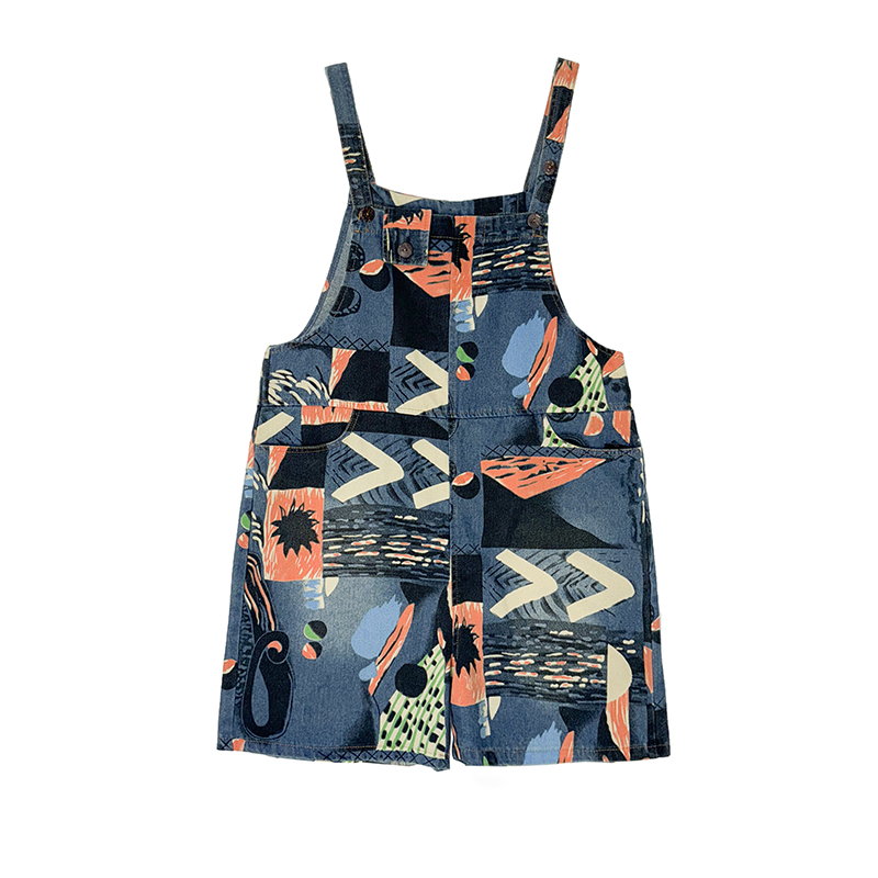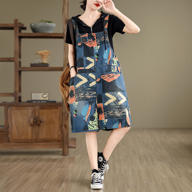 吊带连体裤 洋气复古印花牛仔背带短裤 胖mm宽松显瘦工装 大码 女夏季