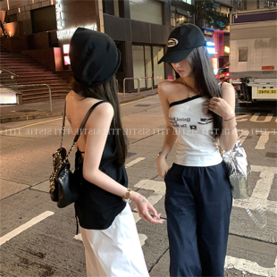 小众美式 T恤女夏季 撞色斜肩设计感背心上衣 辣妹纯欲无袖 小姐姐