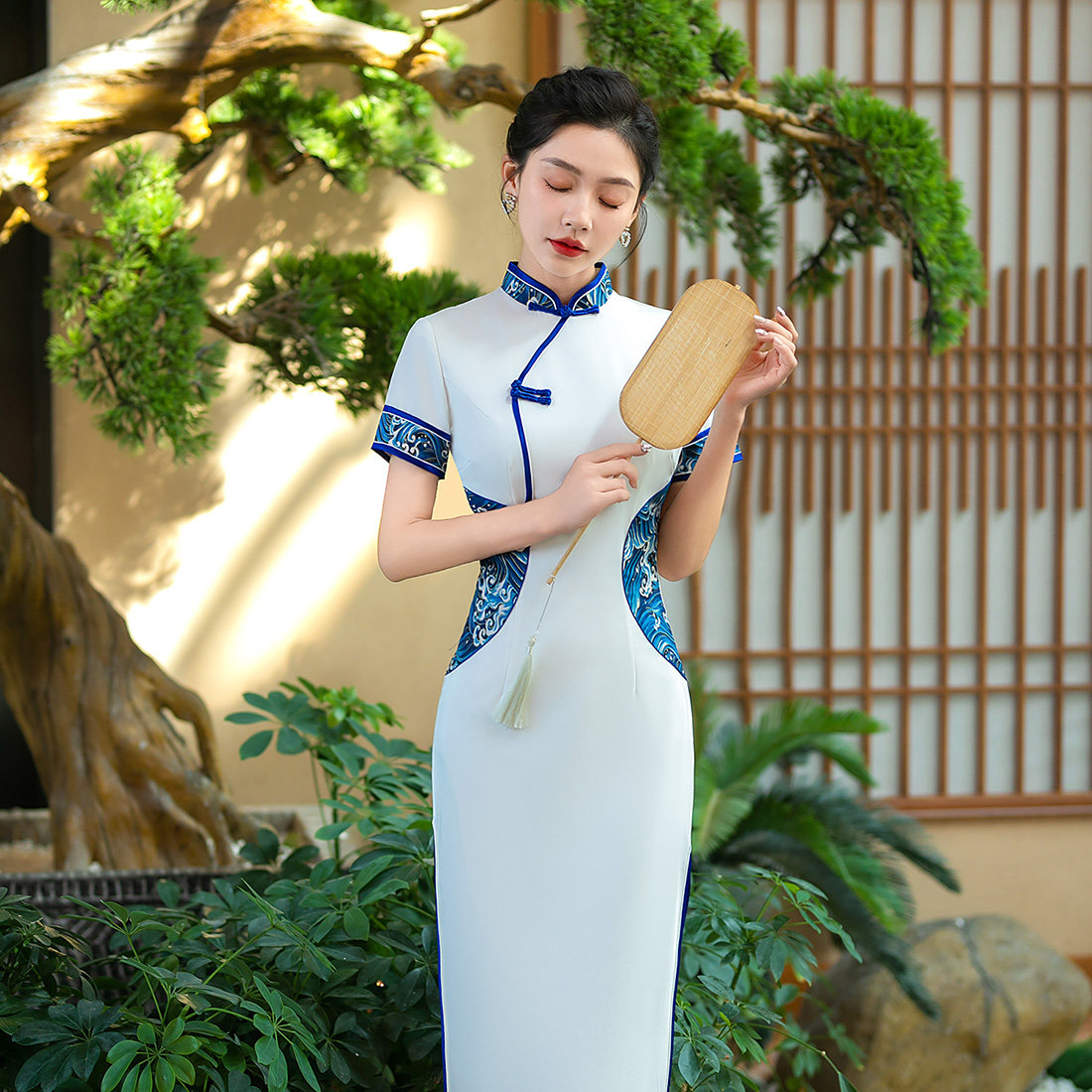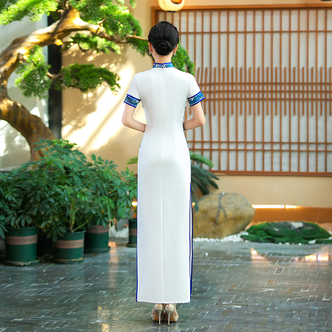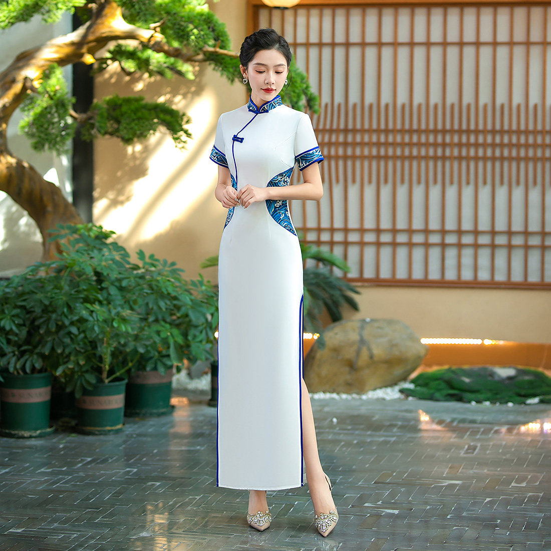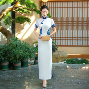 织锦缎礼仪长旗袍剪彩走秀短袖 旗袍裙 旗袍连衣裙演出拍照活动女装