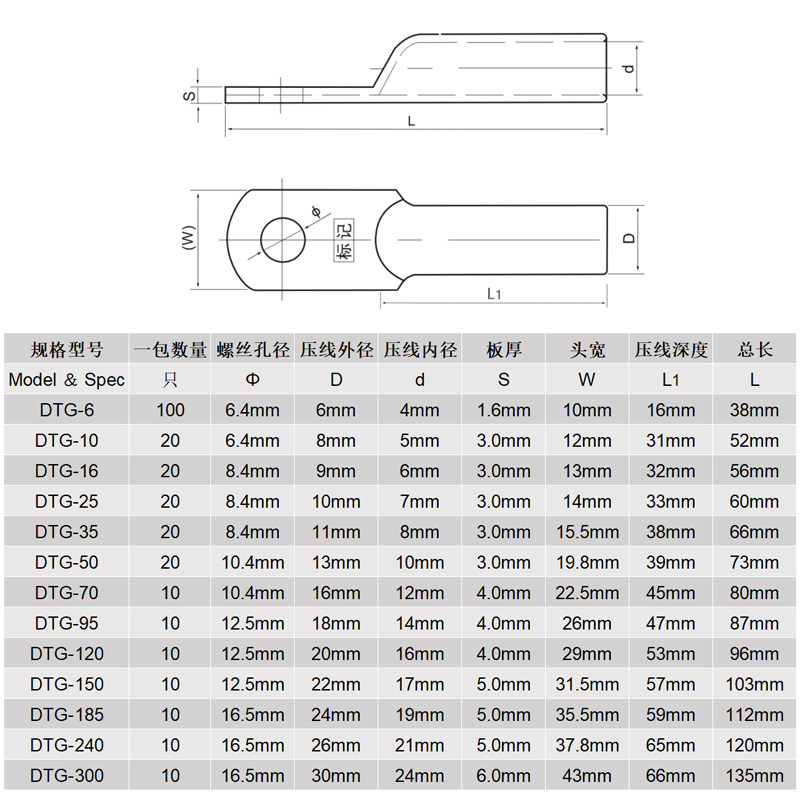 DT铜鼻子接线端子电线铜线鼻子镀锡堵油铜接头25 50平方铜线耳