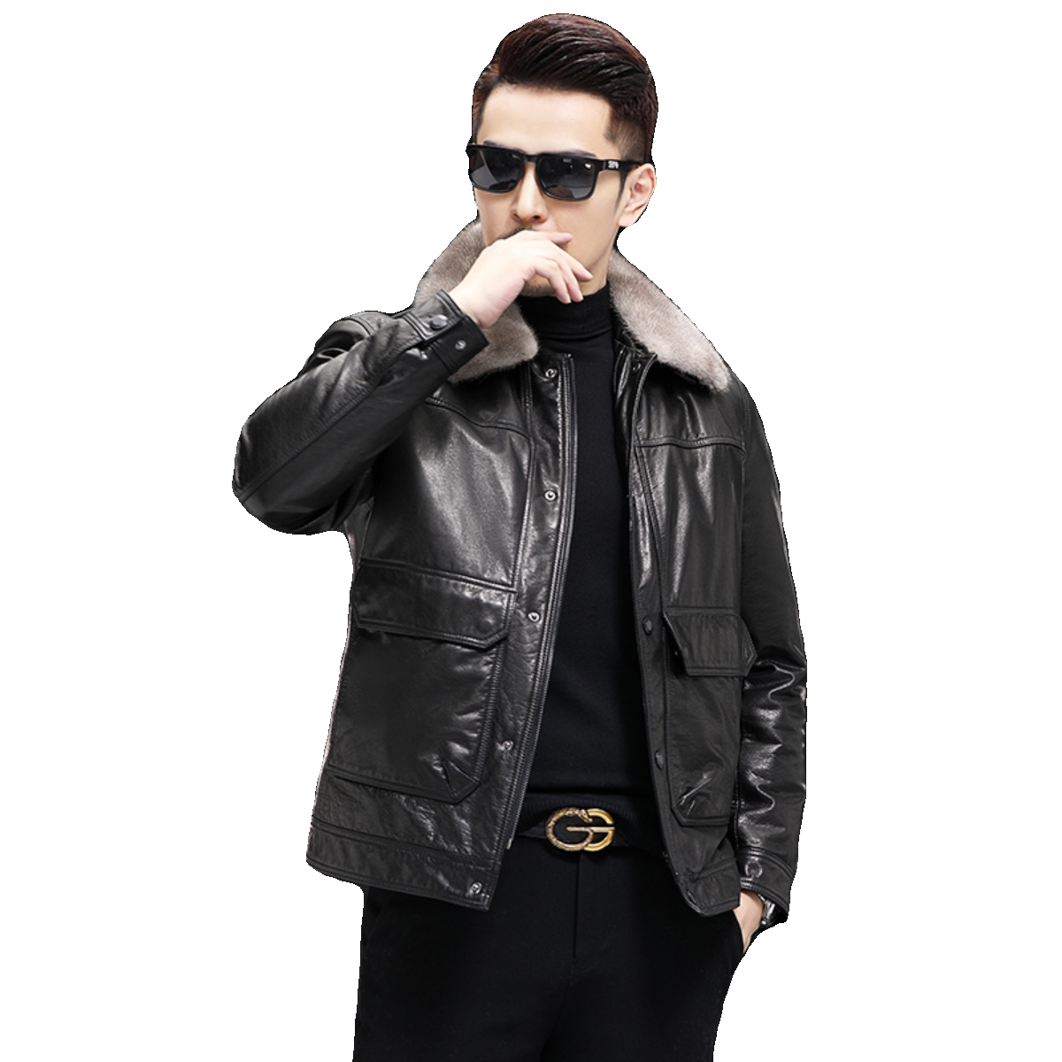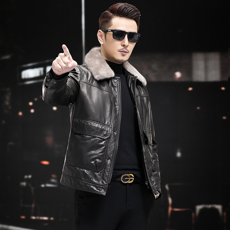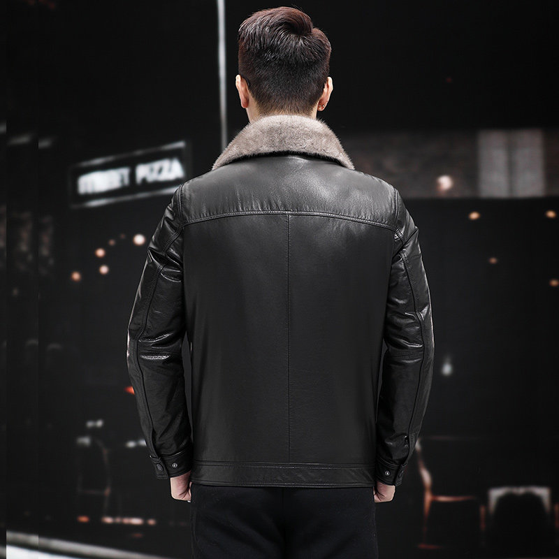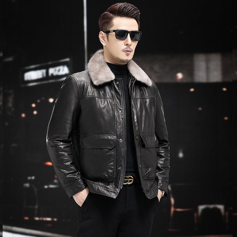 男士 水貂领可脱卸羽绒内胆油蜡牛皮夹克外套 翻领真皮皮衣海宁冬季