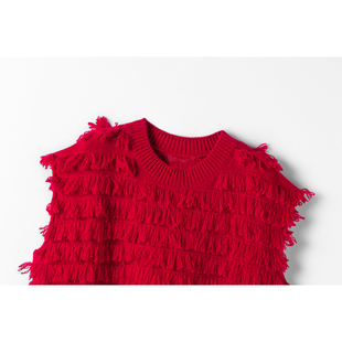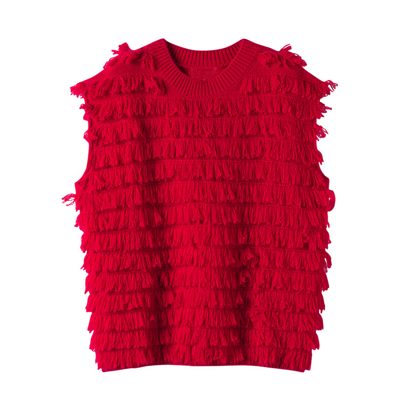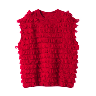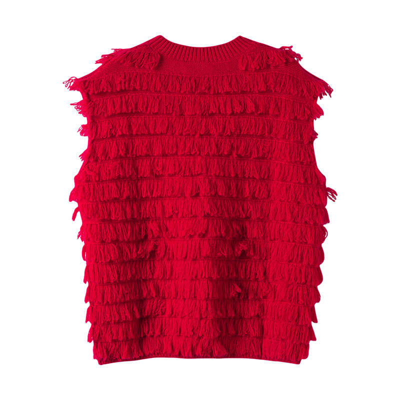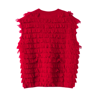 气质无限美 百分百纯羊绒针织背心女 全羊绒毛巾绣流苏须圆领无袖