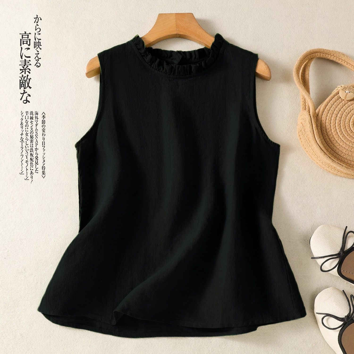 外穿木耳领打底衬衫 复古棉麻小背心上衣女装 新款 内搭衬衣夏季 无袖