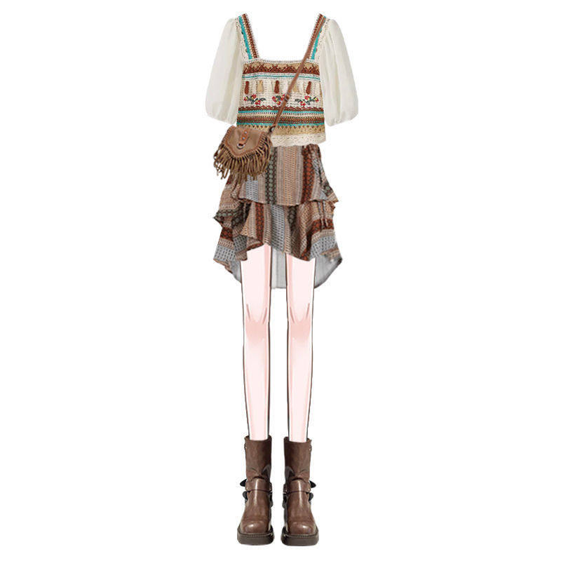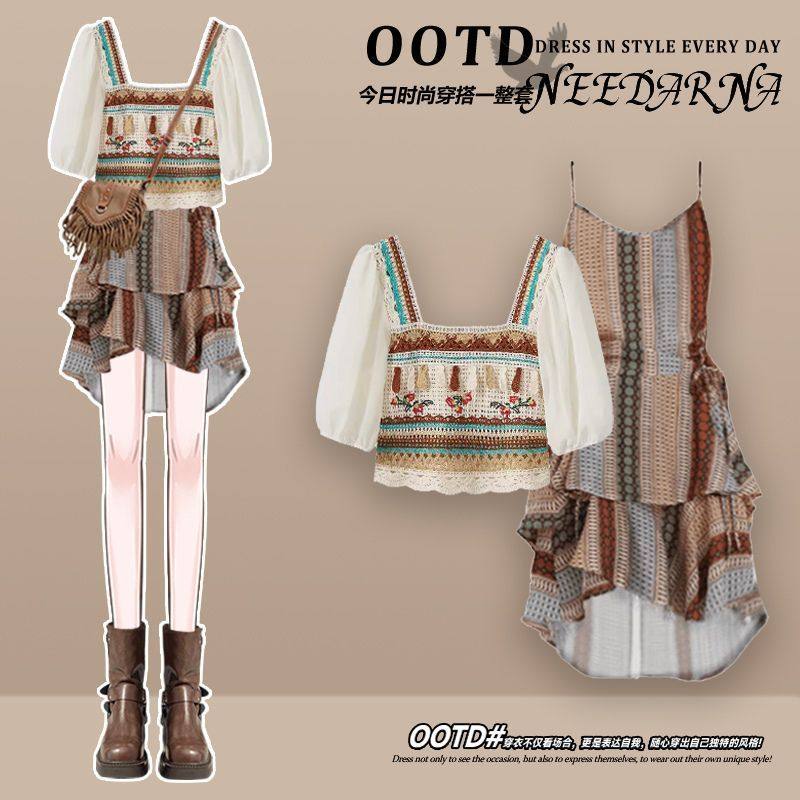 进口夏季 上衣波西米亚吊带连衣裙显瘦两 一整套穿搭女民族风短袖