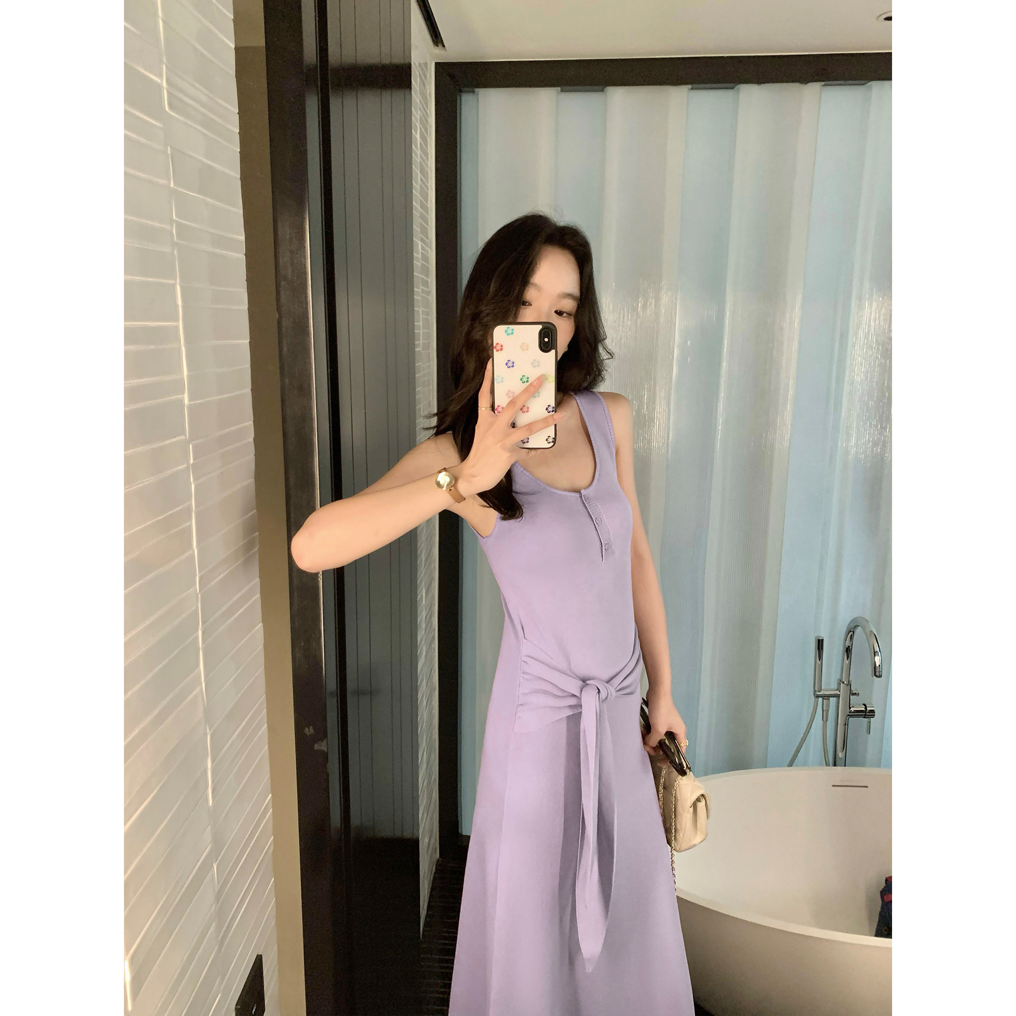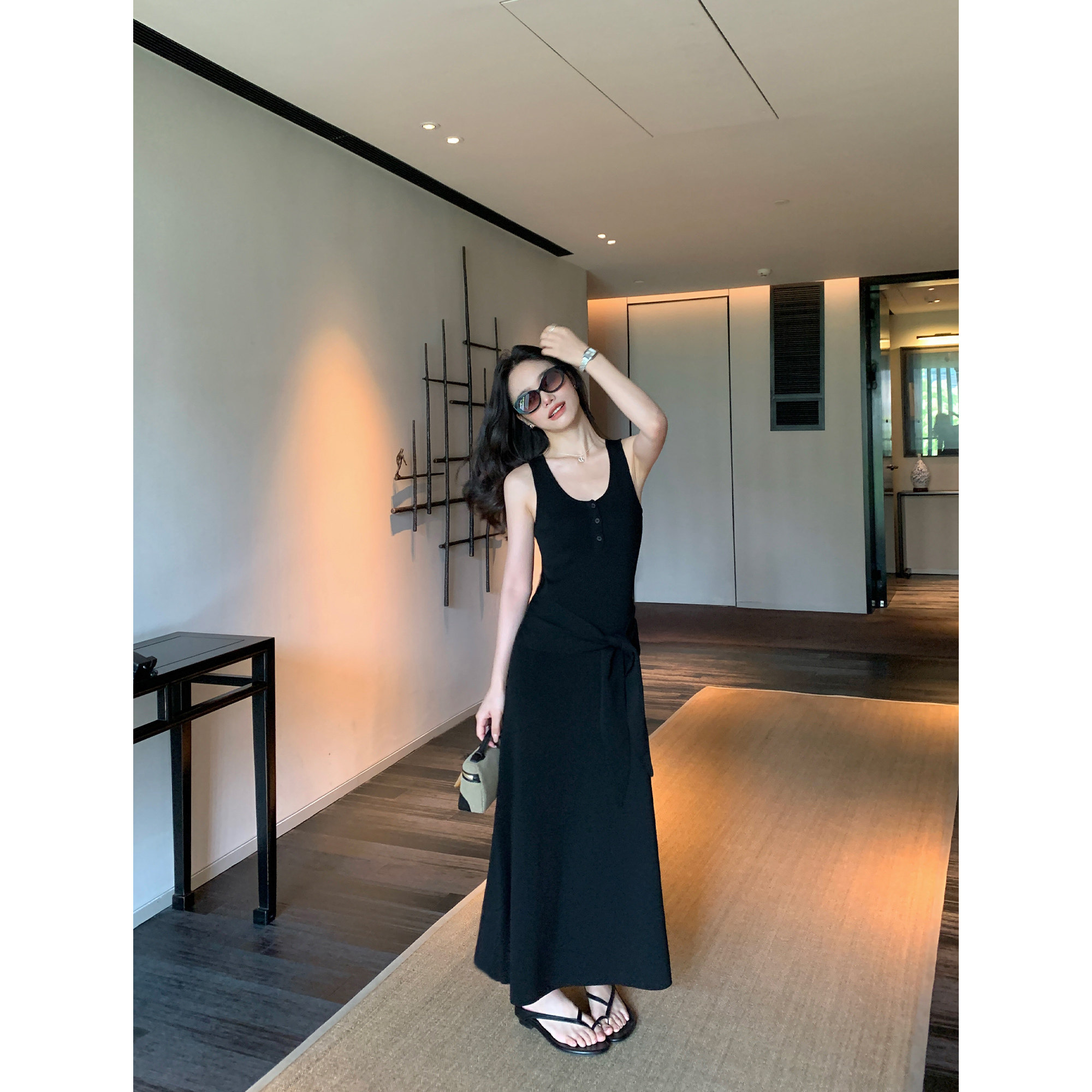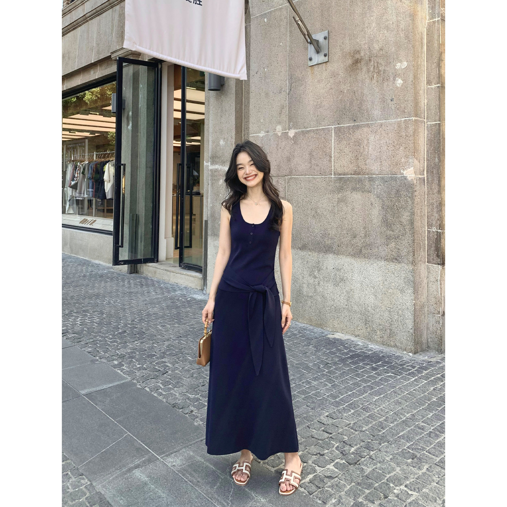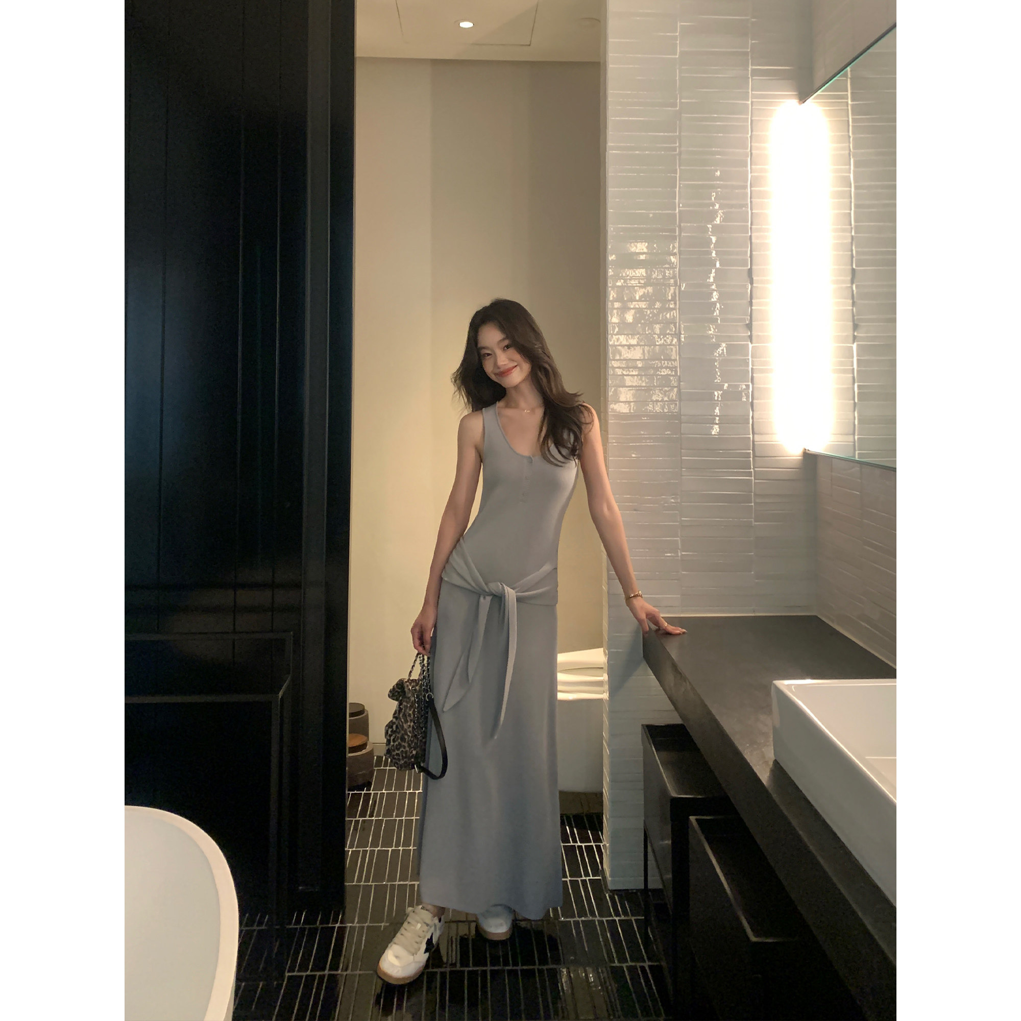 针织连衣裙女温柔收腰气质长裙 系带背心裙无袖 pusumede 色系美学