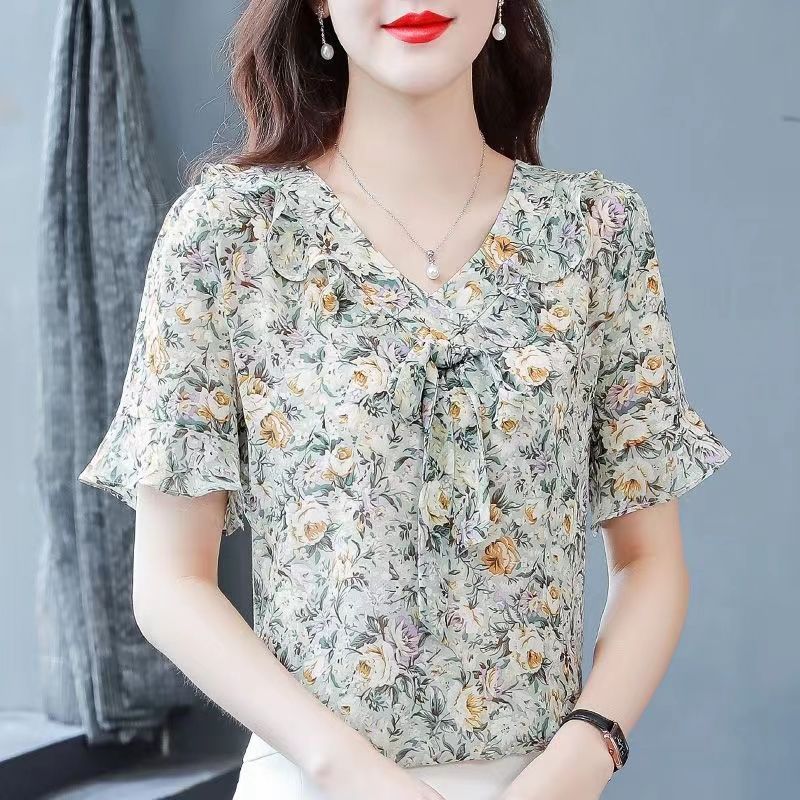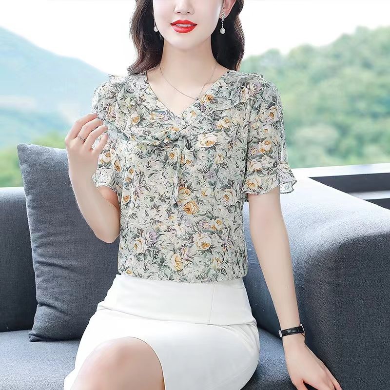 女夏季 别致上衣雪纺衫 2024新款 荷叶边短袖 设计感洋气韩版 碎花小衫