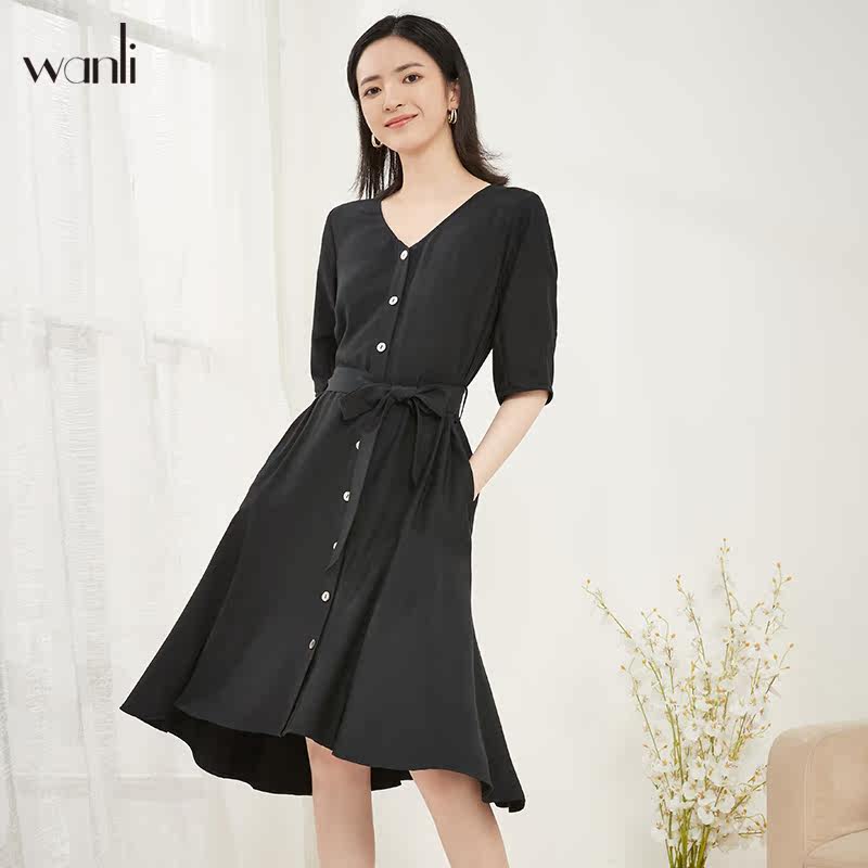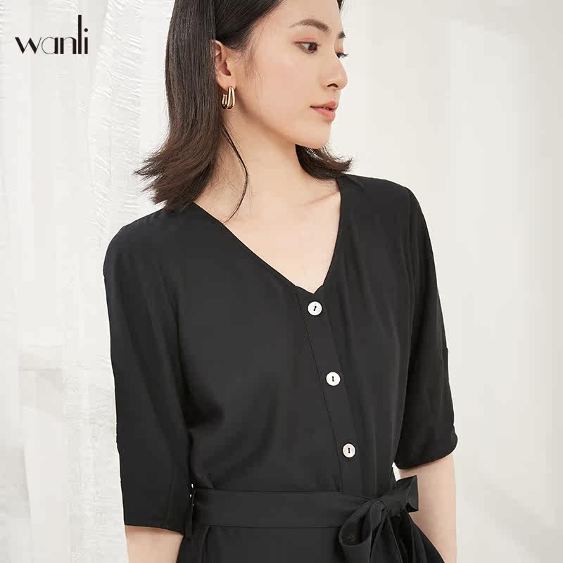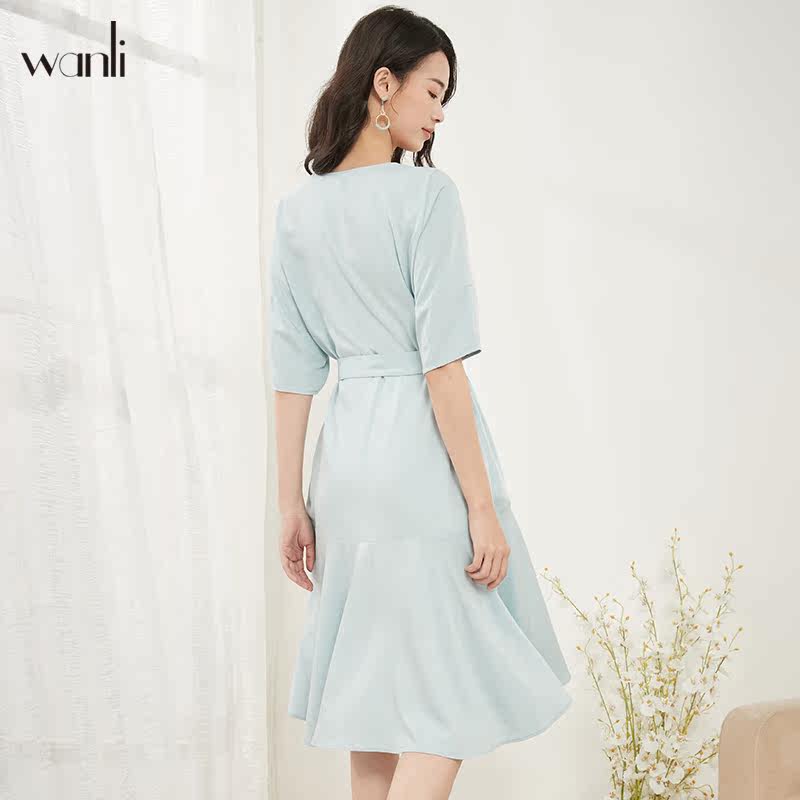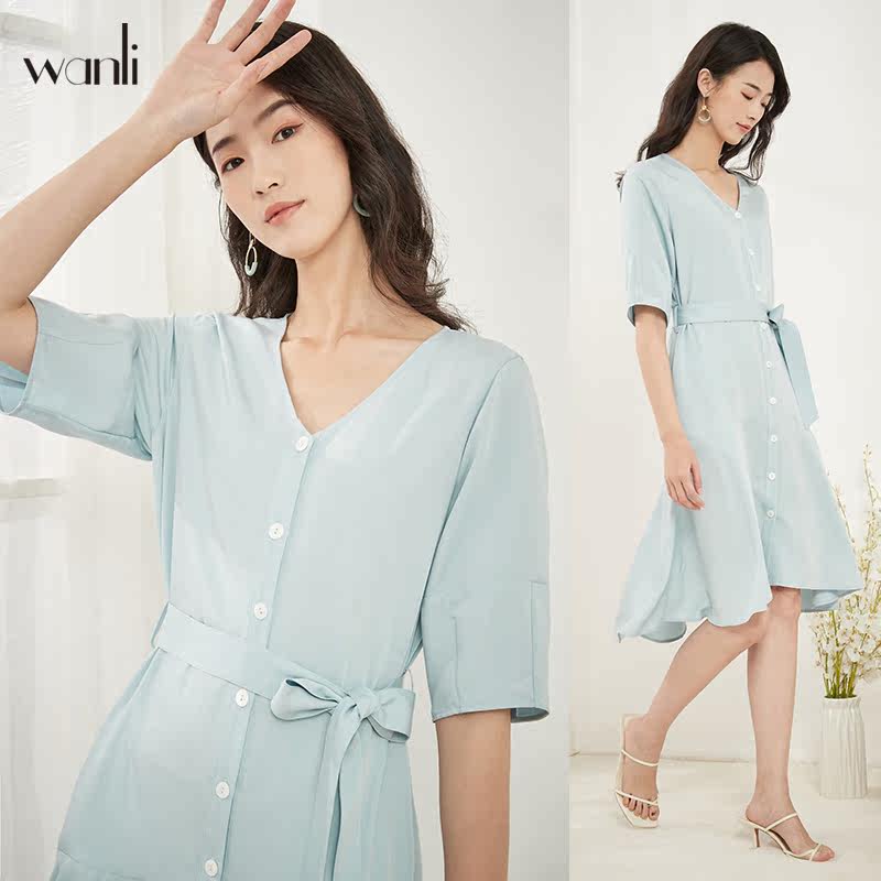 连衣裙女式 万丽 短袖 女装 V领收腰雪纺气质女士连衣裙 服饰
