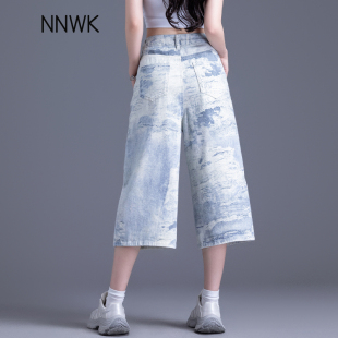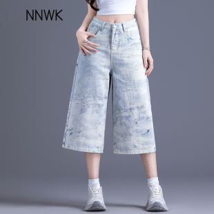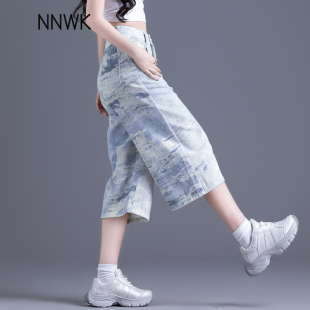 高街七分牛仔短裤 显瘦直筒中裤 女2026新款 水墨画阔腿裤 夏薄款 美式
