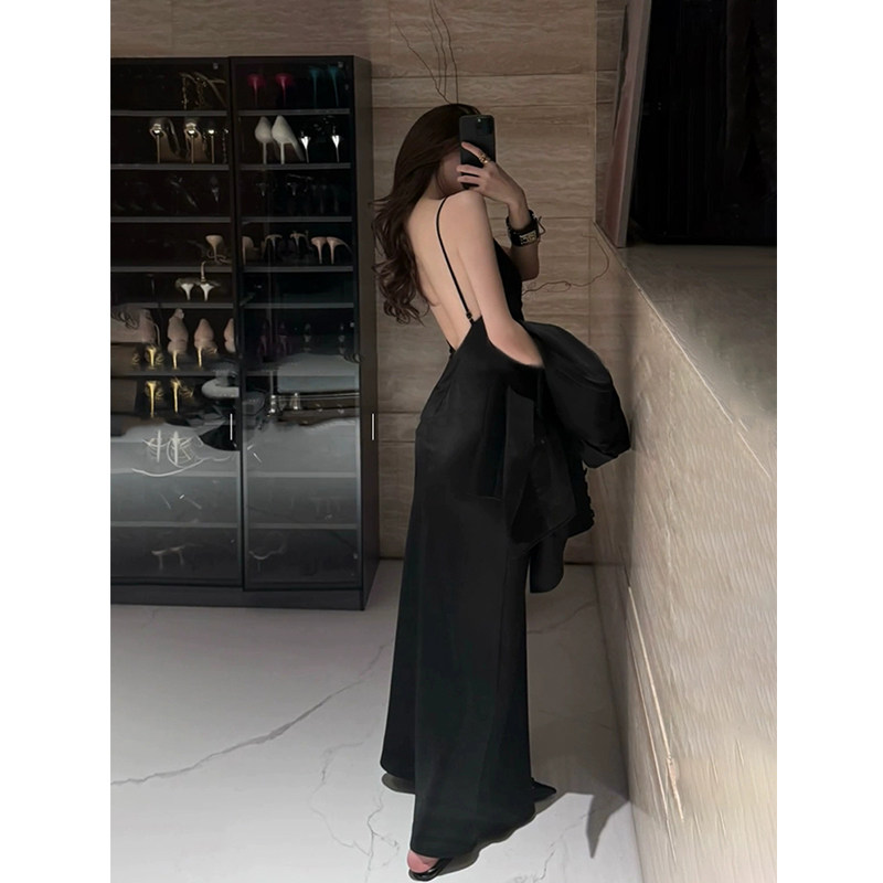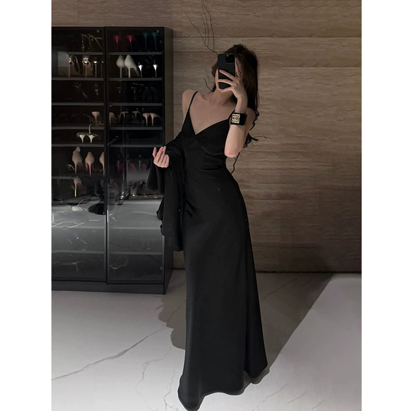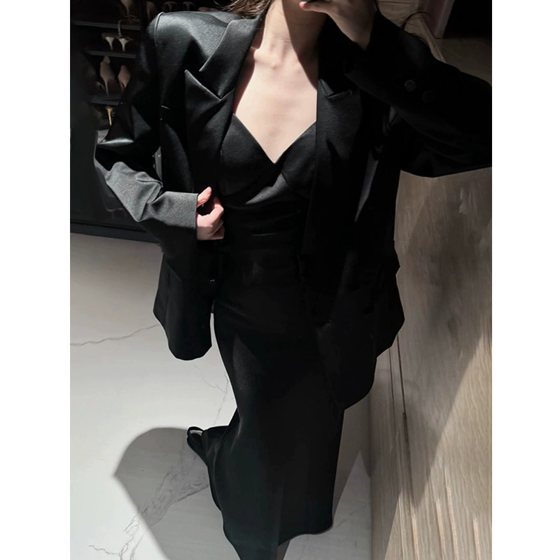 外套女25年夏黑色吊带包臀裙套装 XZY 微胖御姐气质高级感缎面西装