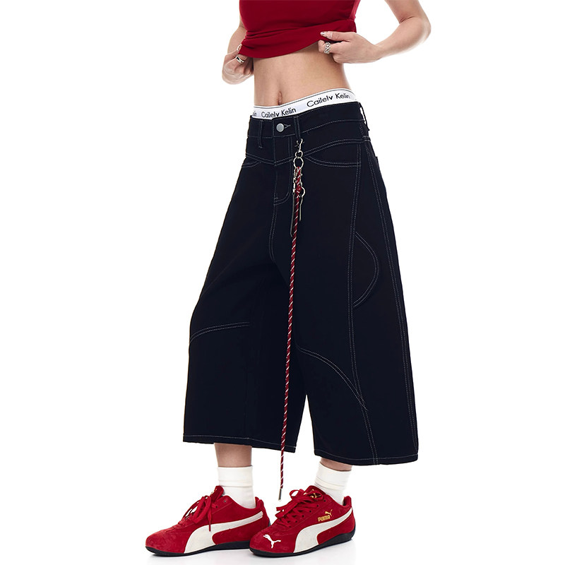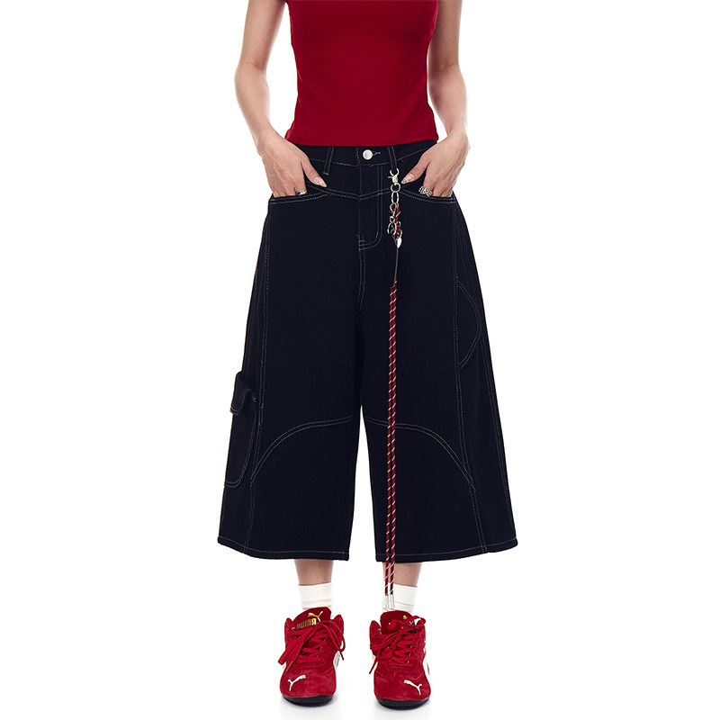 宽松休闲阔腿牛仔七分裤 美式 男女夏季 短裤 复古高街解构多口袋工装