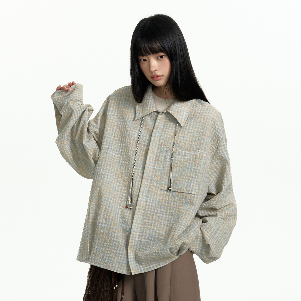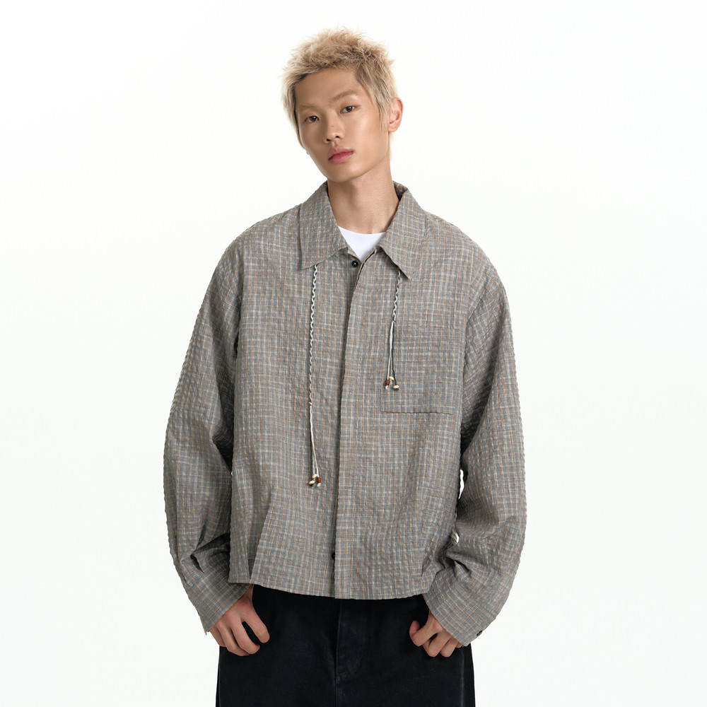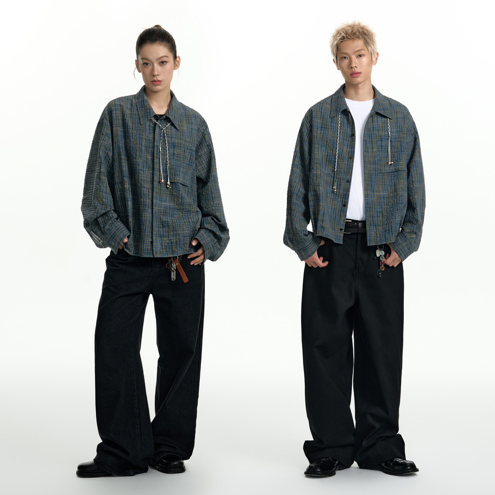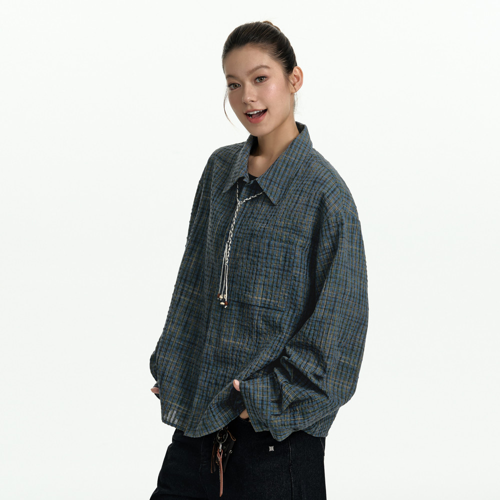 复古格子衬衣男生长袖 美式 设计感外套 女秋季 TGNS肌理感格纹衬衫