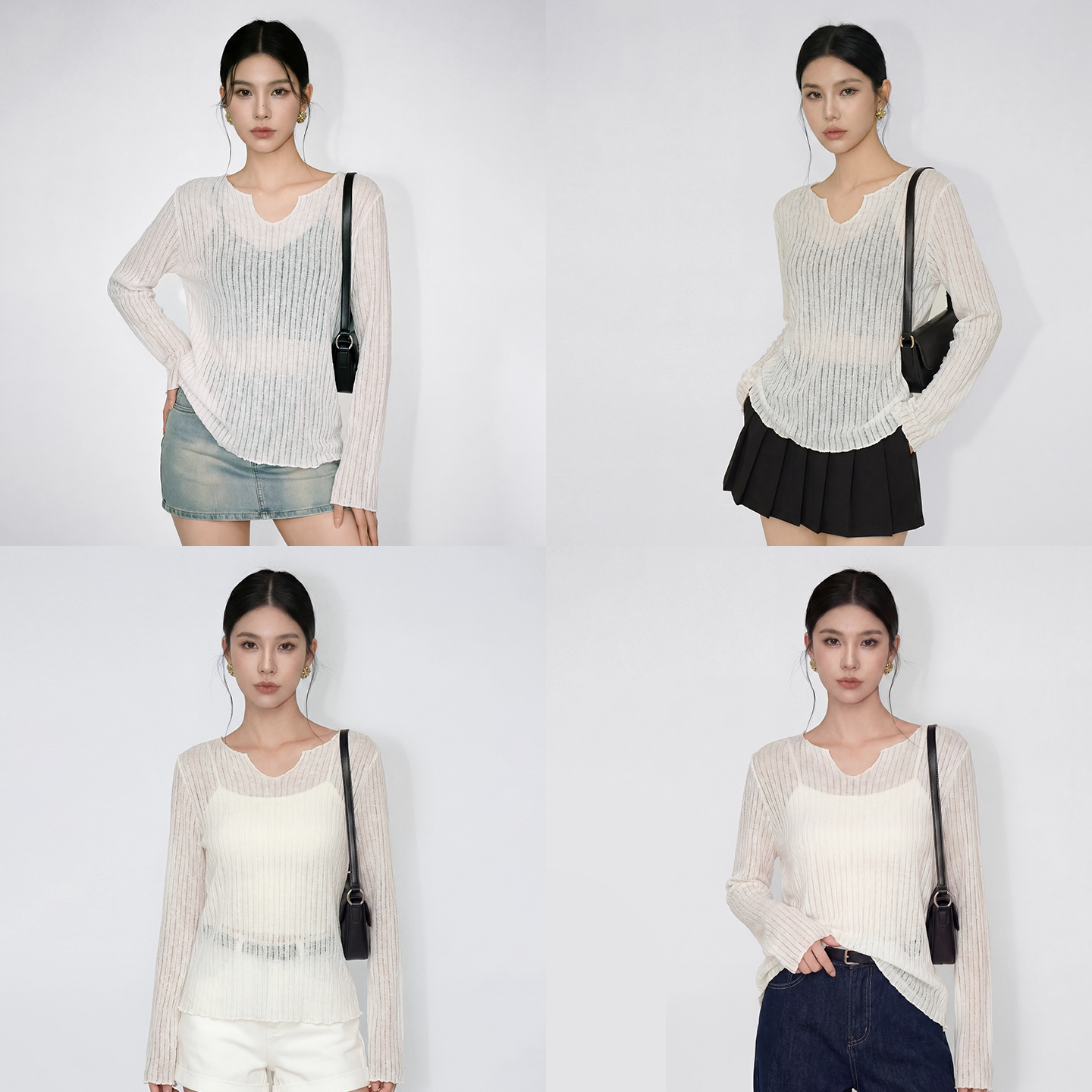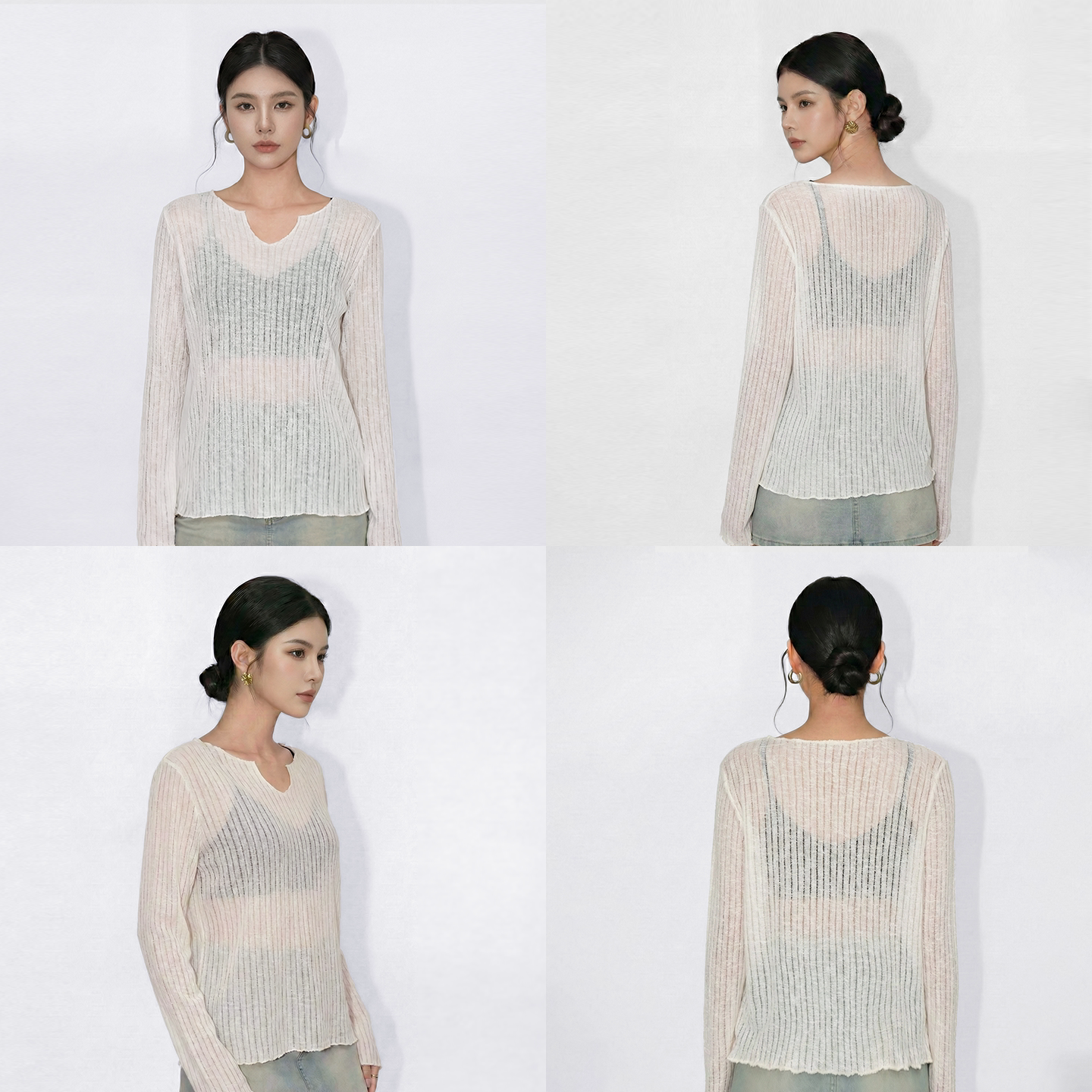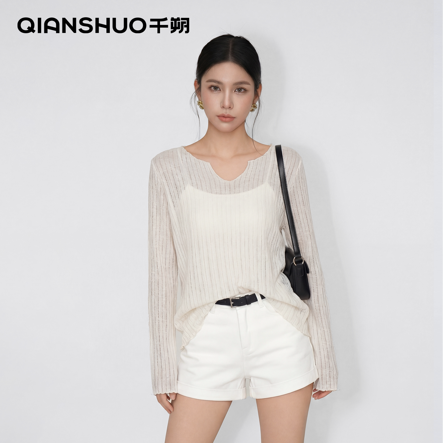 T恤女春夏上衣 长袖 千朔微透防晒小罩衫 宽松慵懒松弛感V领冰丝薄款
