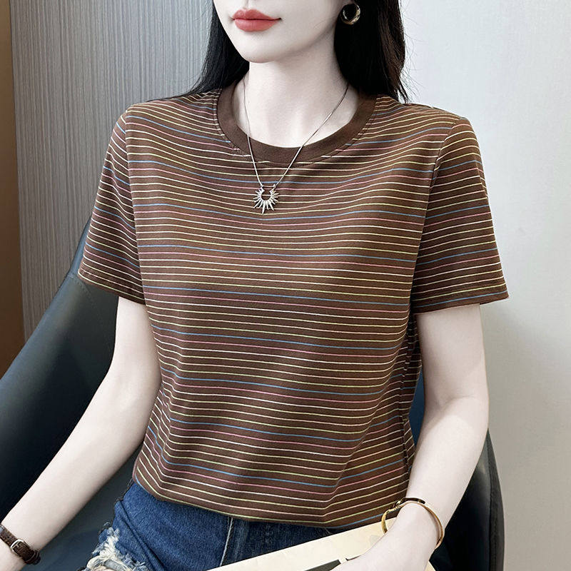 纯棉圆领上衣妈妈洋气小衫 正肩条纹恤女短袖 宽松半袖 2026新款 夏季
