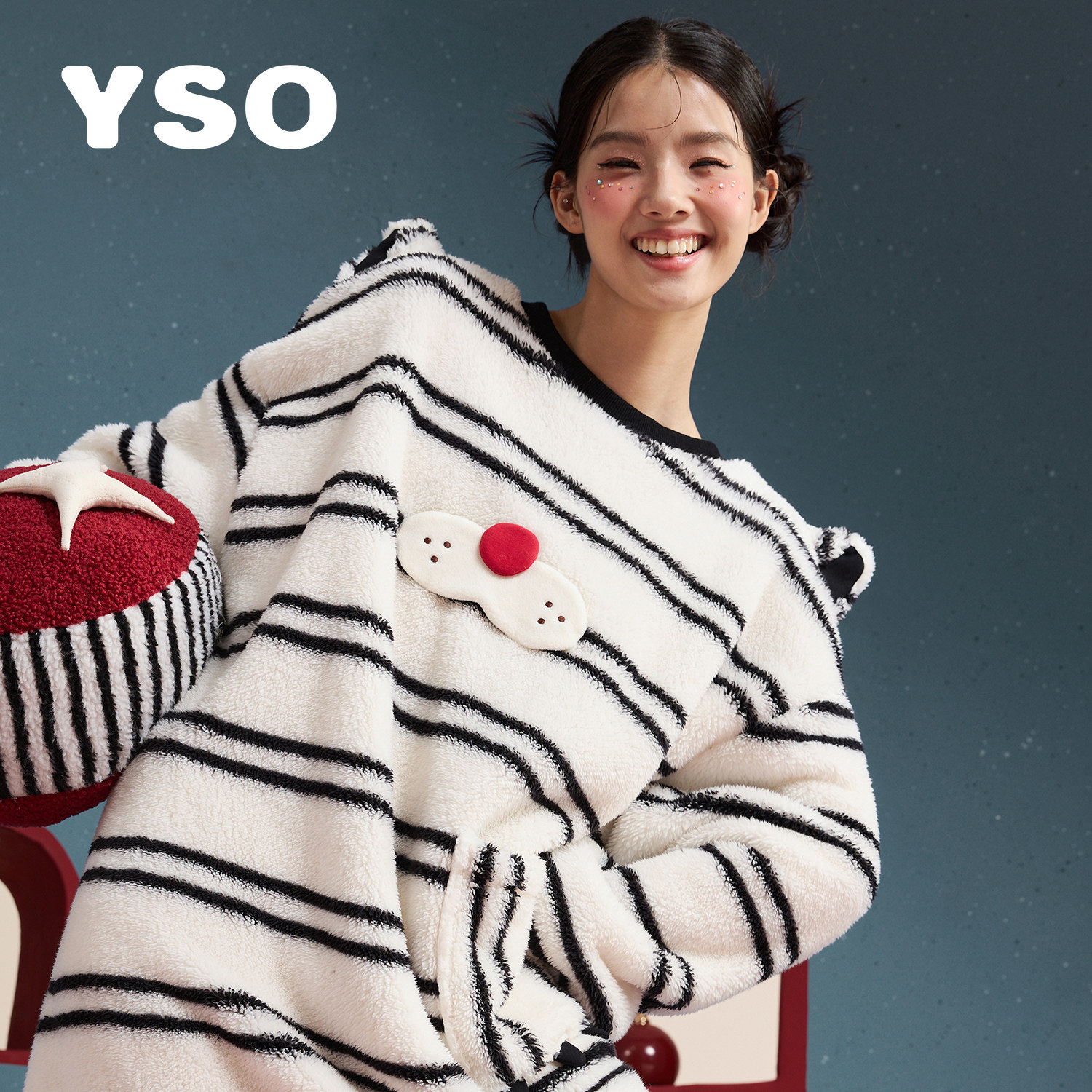 条纹家居服 加厚加绒冬天珊瑚绒长款 悦内睡袍女睡衣睡裙秋冬款 冬季