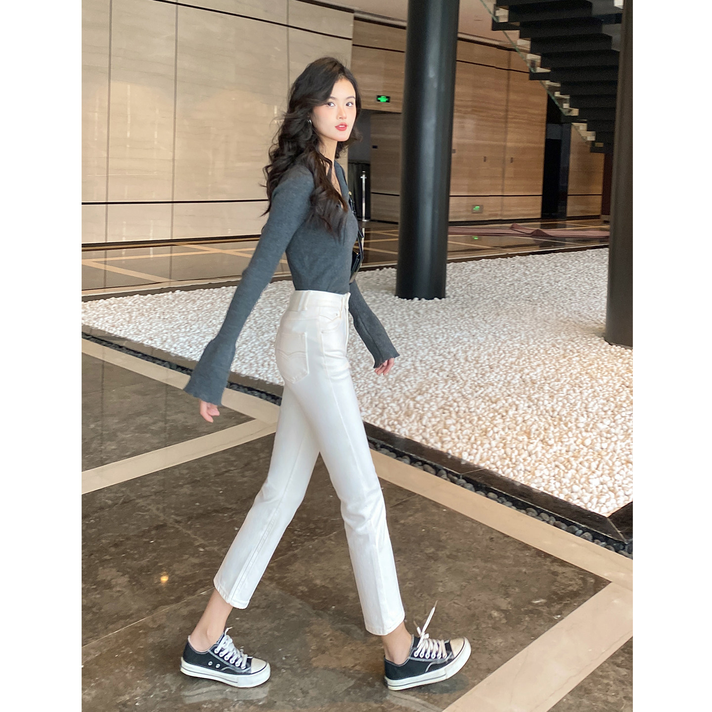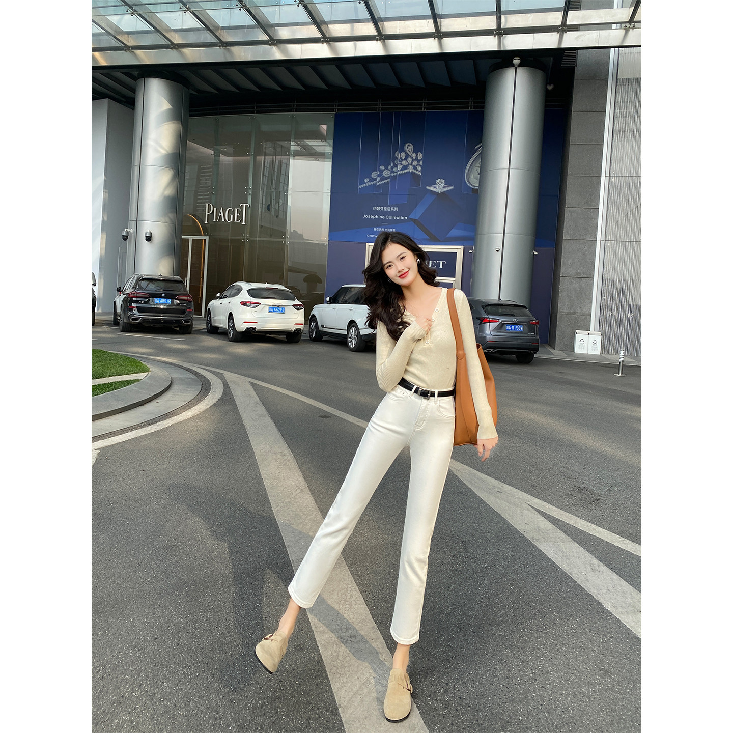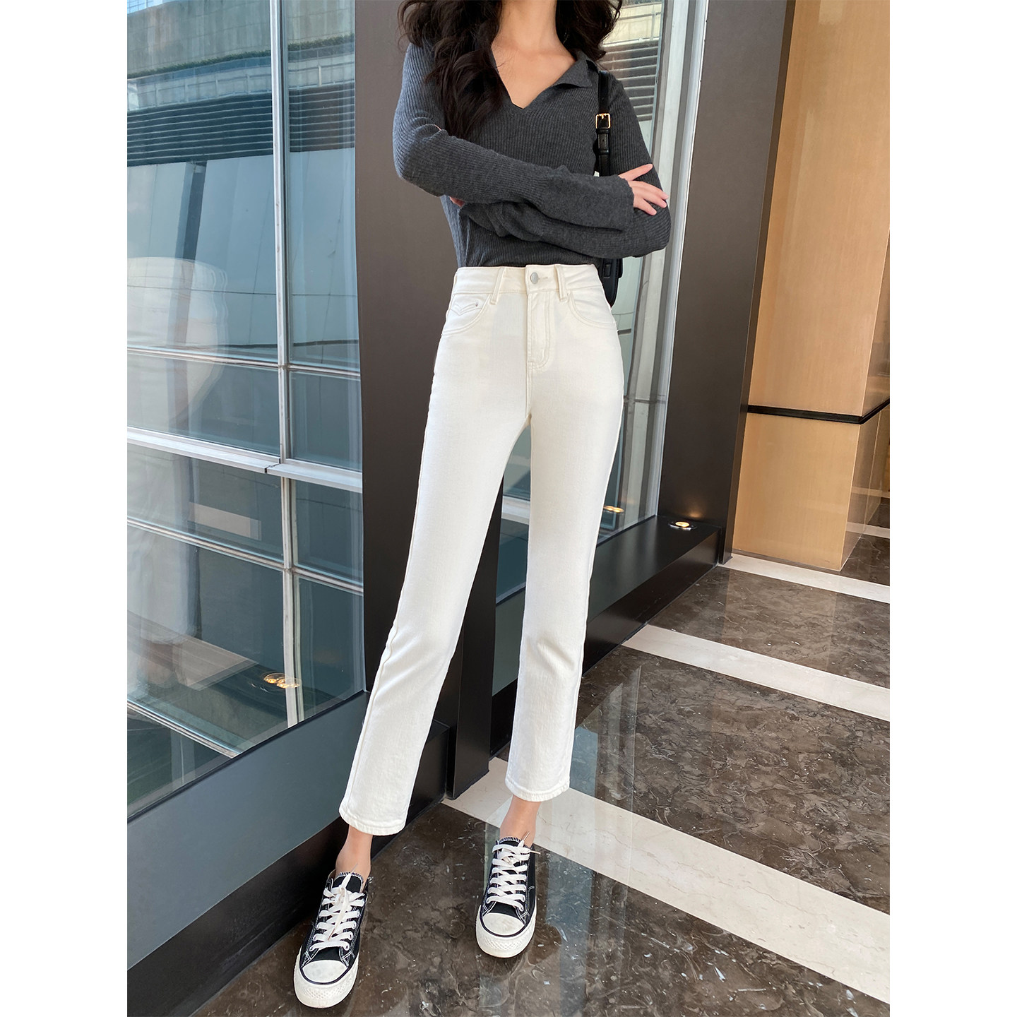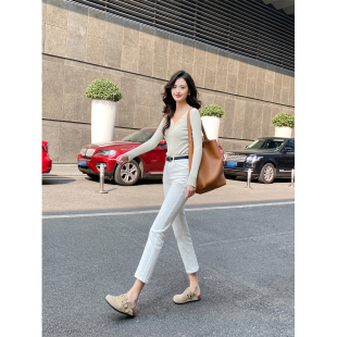 九分显瘦百搭九分烟管裤 新款 子 女春季 米白色小个子高腰直筒牛仔裤