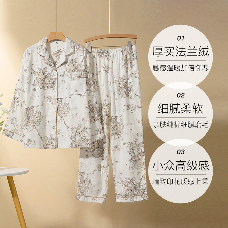 toratani纯棉磨毛亲肤厚实法兰绒优雅印花女士睡衣家居服 自营