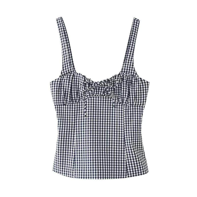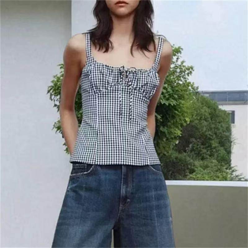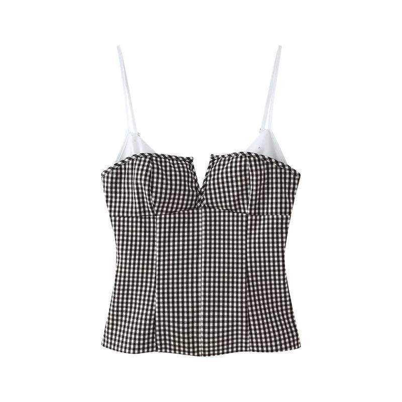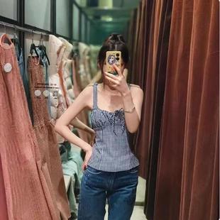 4661023 打底拼接小格纹弹力上衣吊带 ZA外贸出口4661024新品 女装