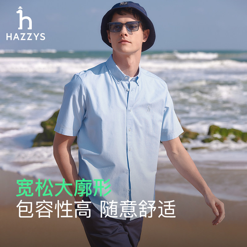 休闲舒适纯色宽松短袖 LOGO牛津纺衬衫 衬衣男 经典 Hazzys哈吉斯夏季