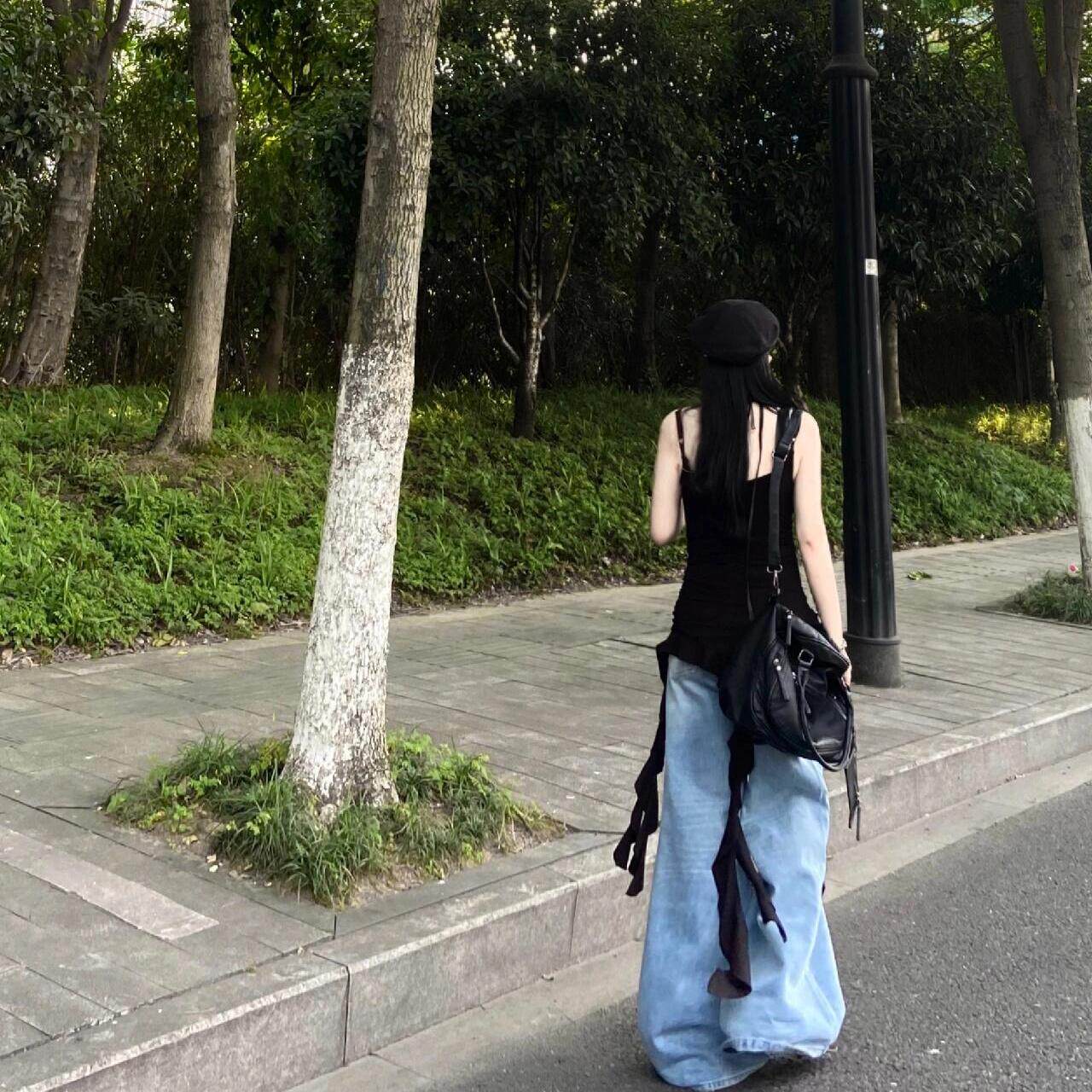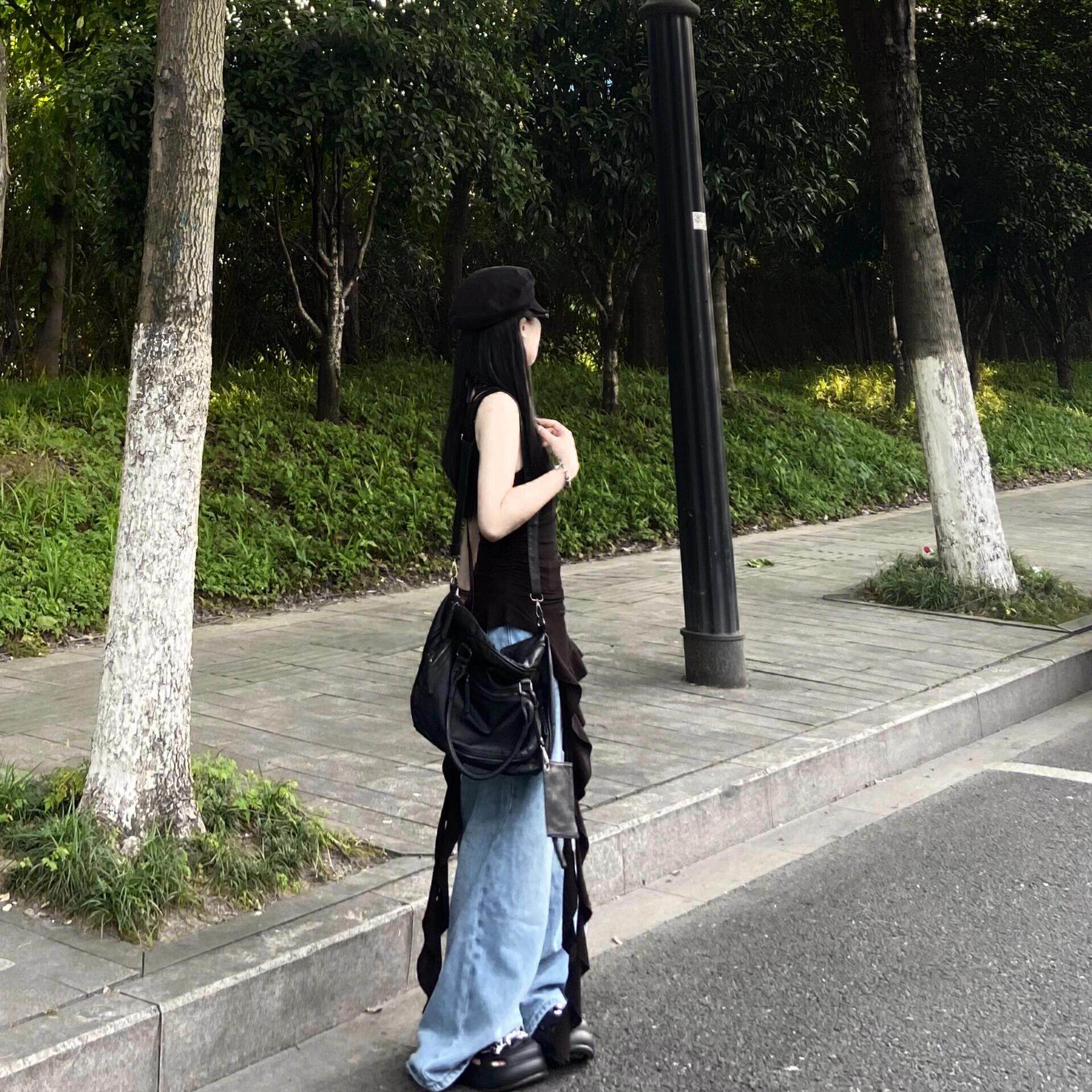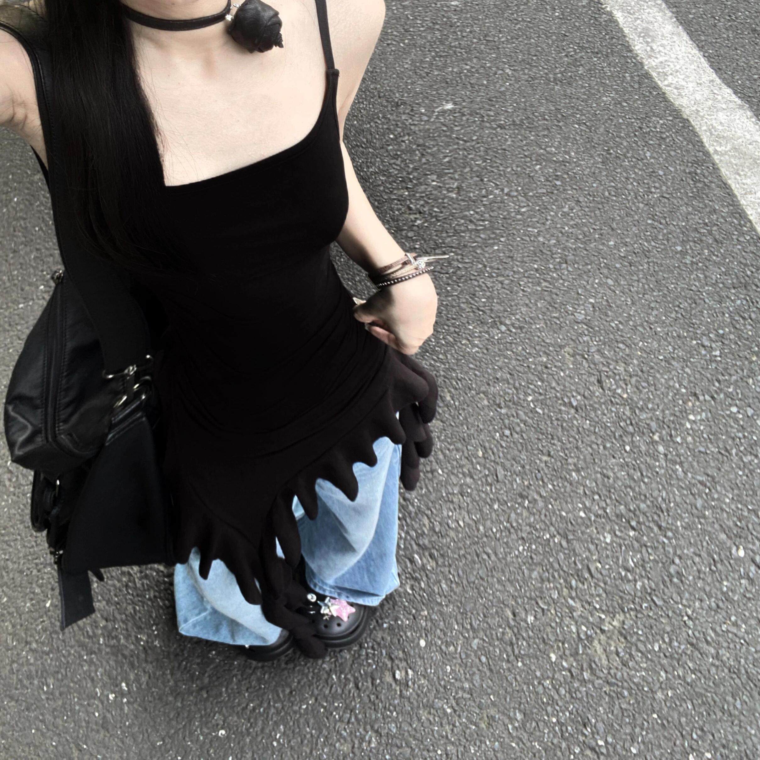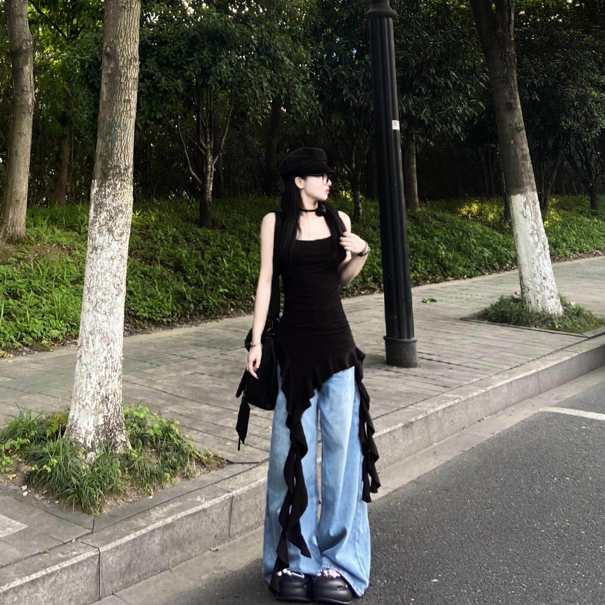 夏季 性感纯欲风内搭潮 黑色不对称飘带吊带背心女荷叶边设计打底衫