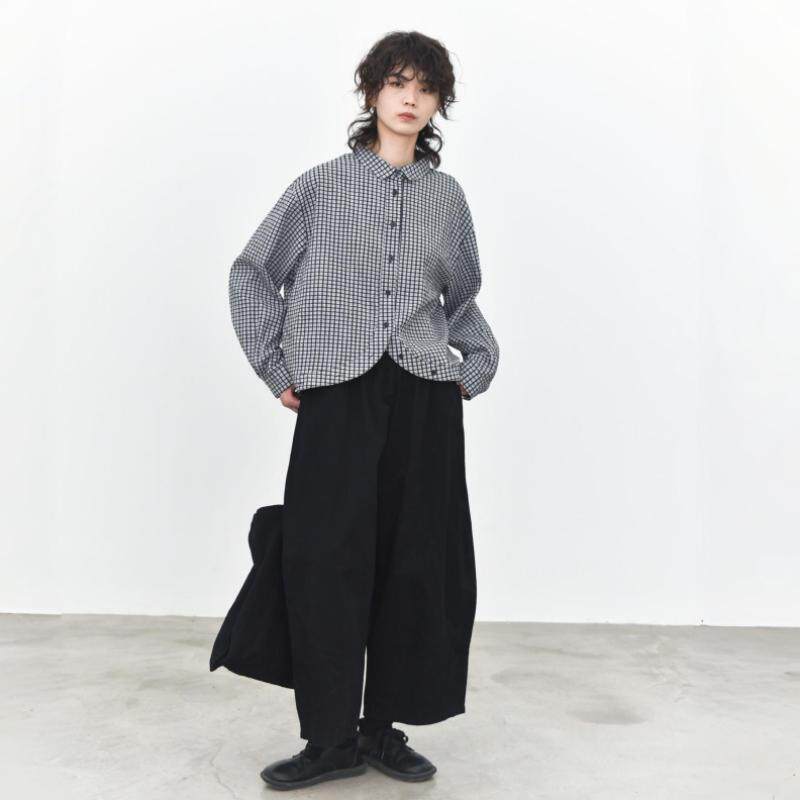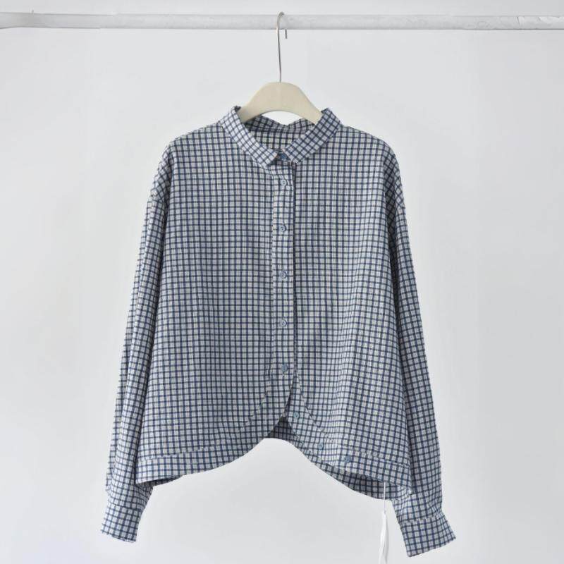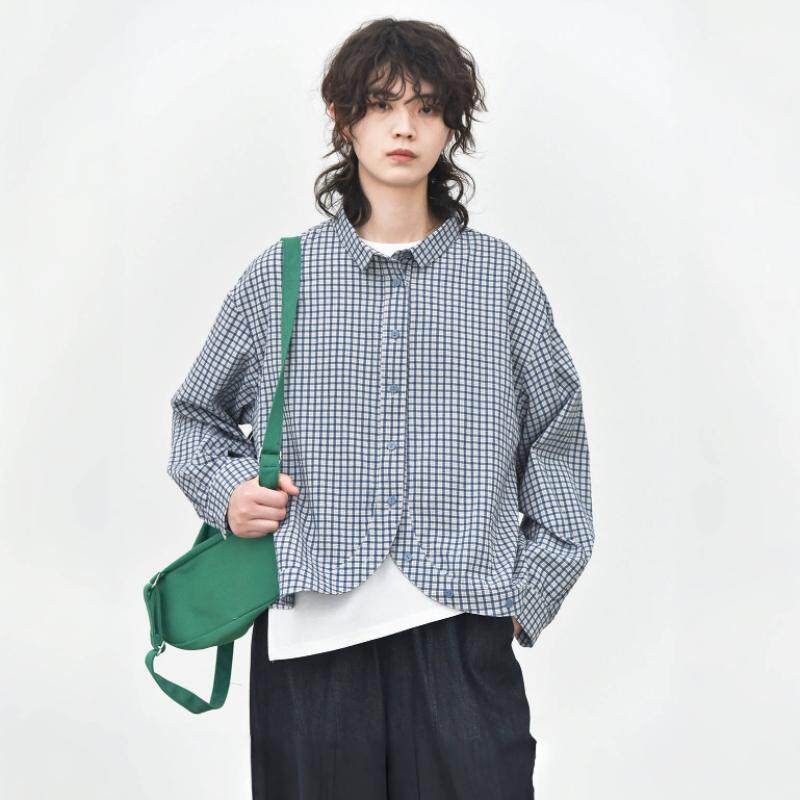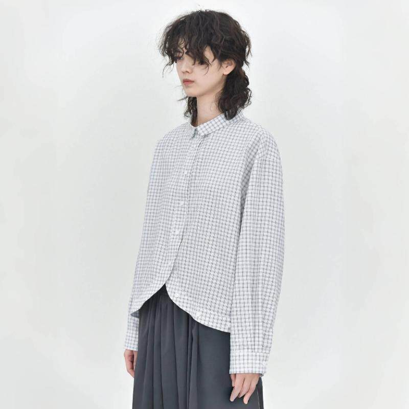 女肌理简约宽松显瘦衬衣 衬衫 童颜阁春款 小众清新格纹弧形下摆长袖