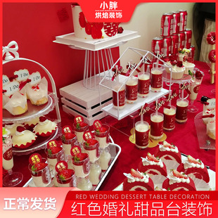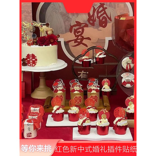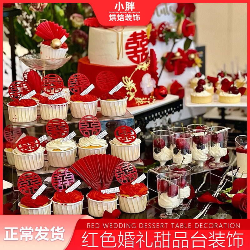 红色婚礼甜品台装 饰结婚纸杯蛋糕摆件wedding喜字插牌布丁纸绑带