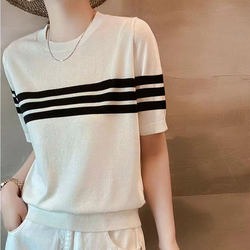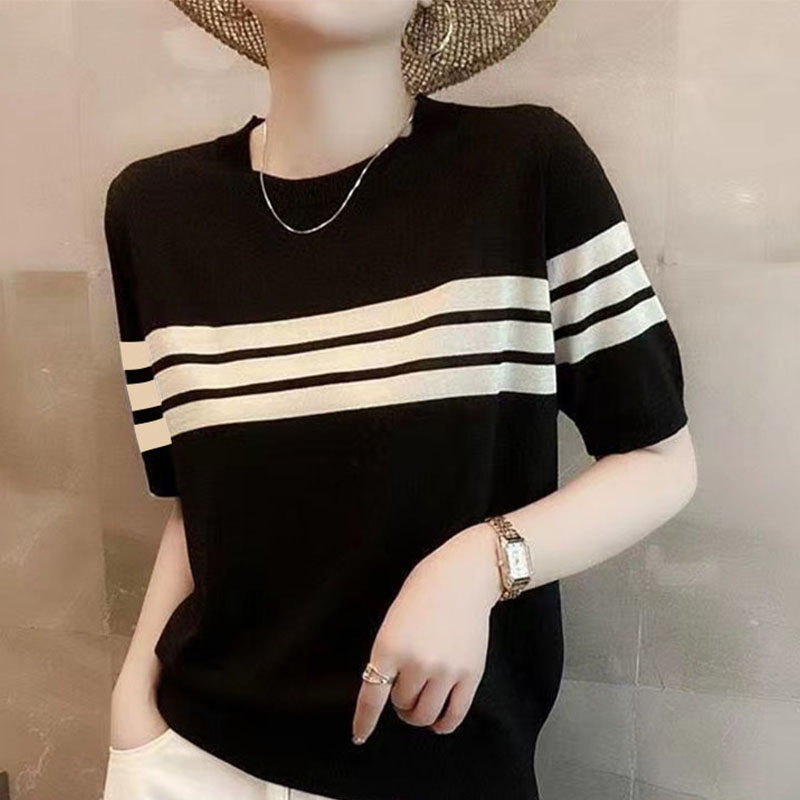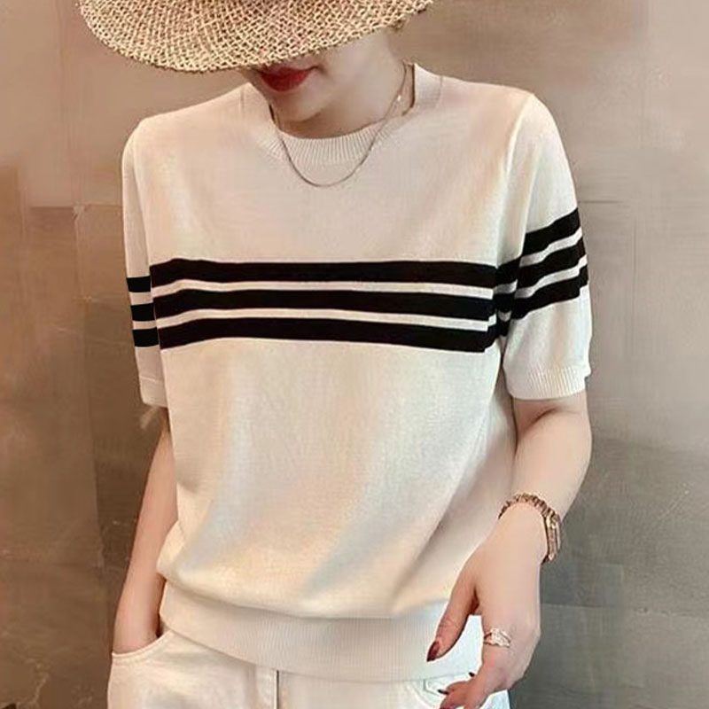 短袖 休闲舒适圆领套头打底衫 减龄显瘦条纹冰丝针织衫 韩版 上衣 夏季