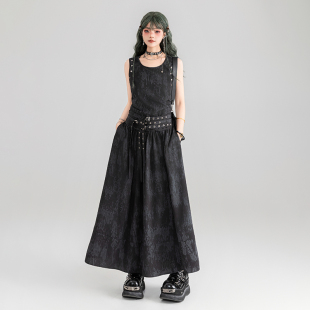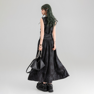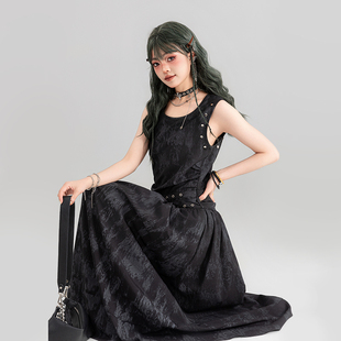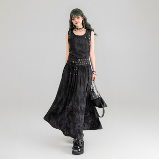 KEIKO酷飒新中式 铆钉饰系带显瘦大U领背心长裙 扎染黑色连衣裙夏季