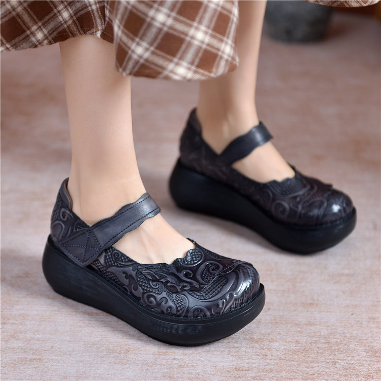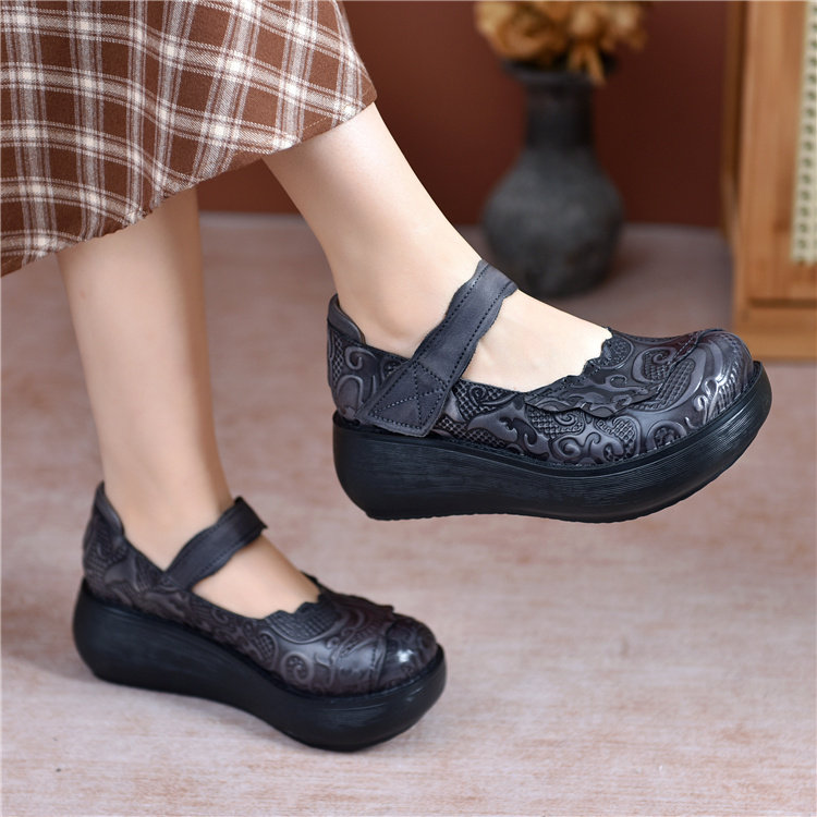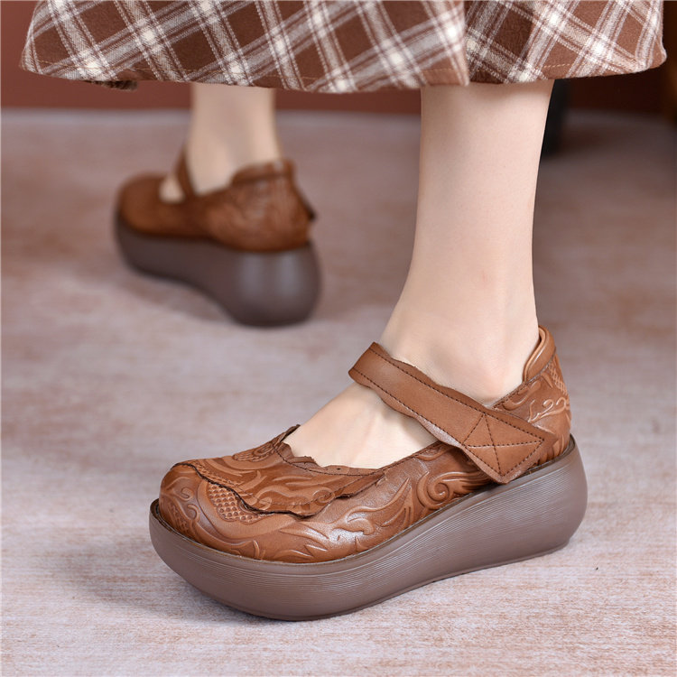 5851厚底单鞋 民族风真皮浅口2026春新魔术贴圆头手工印花松糕鞋