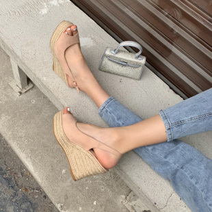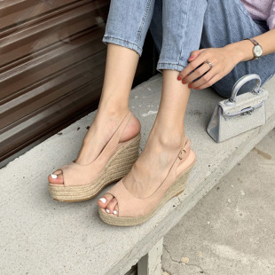 2026年春浅口鱼嘴绒面防水台厚底麻绳编织坡跟凉鞋 9CM超高跟女鞋