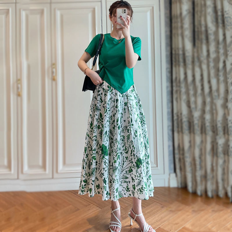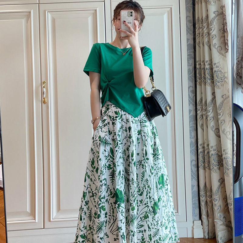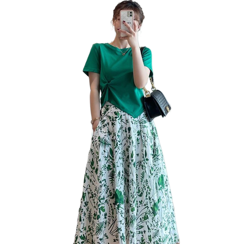 套装 两件套裙夏季 收腰气质上衣碎花口袋半身裙时尚 T恤短袖 女 新款